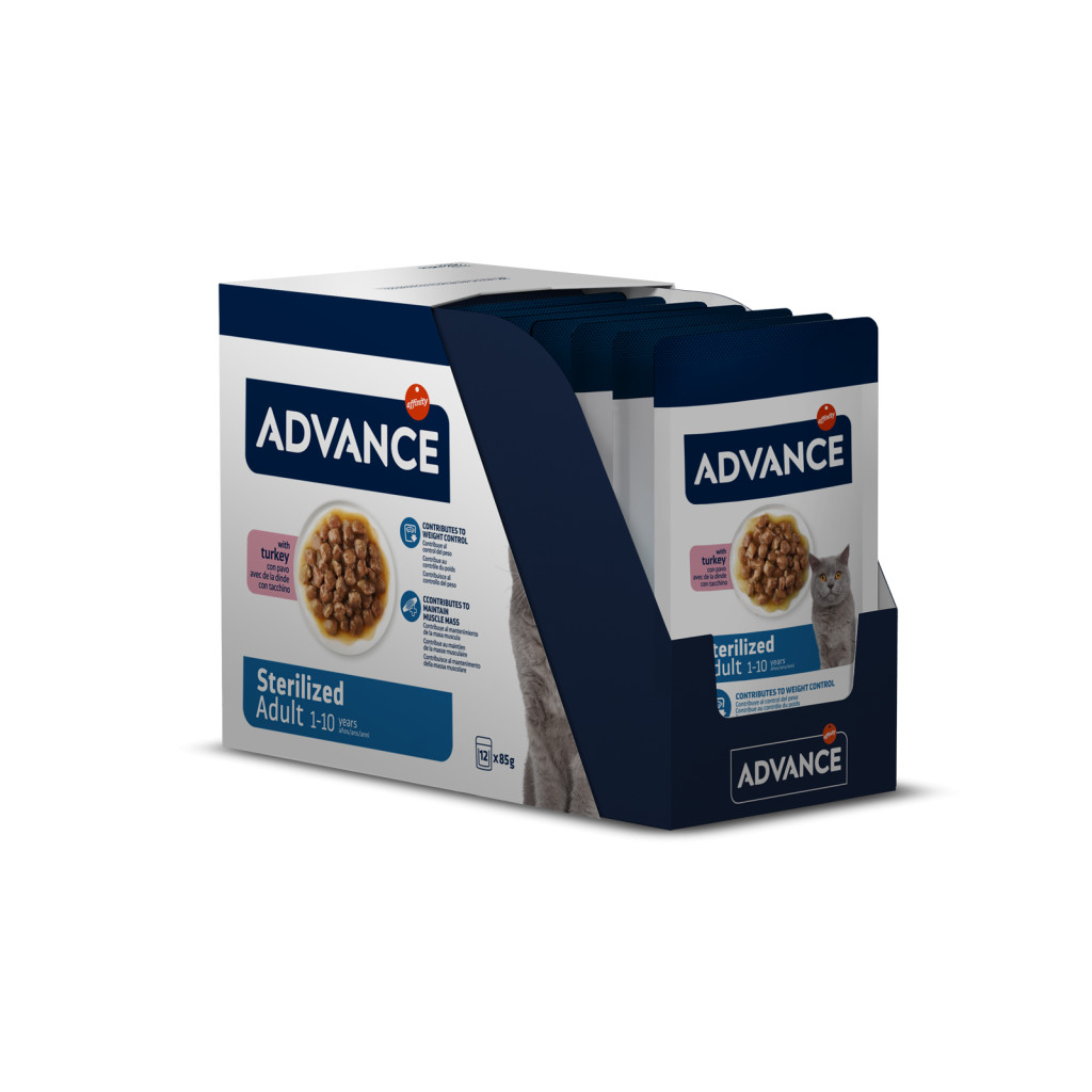 ADVANCE Wet pentru pisici adulte sterilizate este o hrană umedă completă și echilibrată, cu bucățele de curcan gătite la abur, într-un sos delicios. Potrivită pentru pisici între 1 și 10 ani, susține controlul greutății și menținerea masei musculare, având un conținut ridicat de proteine și fibre, un nivel moderat de grăsimi. Fără coloranți sau conservanți, este 100% completă și echilibrată, perfectă pentru alimentația zilnică, oferind un gust extraordinar.