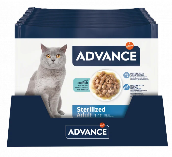 ADVANCE Wet pentru pisici adulte sterilizate este o hrană umedă completă și echilibrată, cu bucățele de curcan gătite la abur, într-un sos delicios. Potrivită pentru pisici între 1 și 10 ani, susține controlul greutății și menținerea masei musculare, având un conținut ridicat de proteine și fibre, un nivel moderat de grăsimi. Fără coloranți sau conservanți, este 100% completă și echilibrată, perfectă pentru alimentația zilnică, oferind un gust extraordinar.