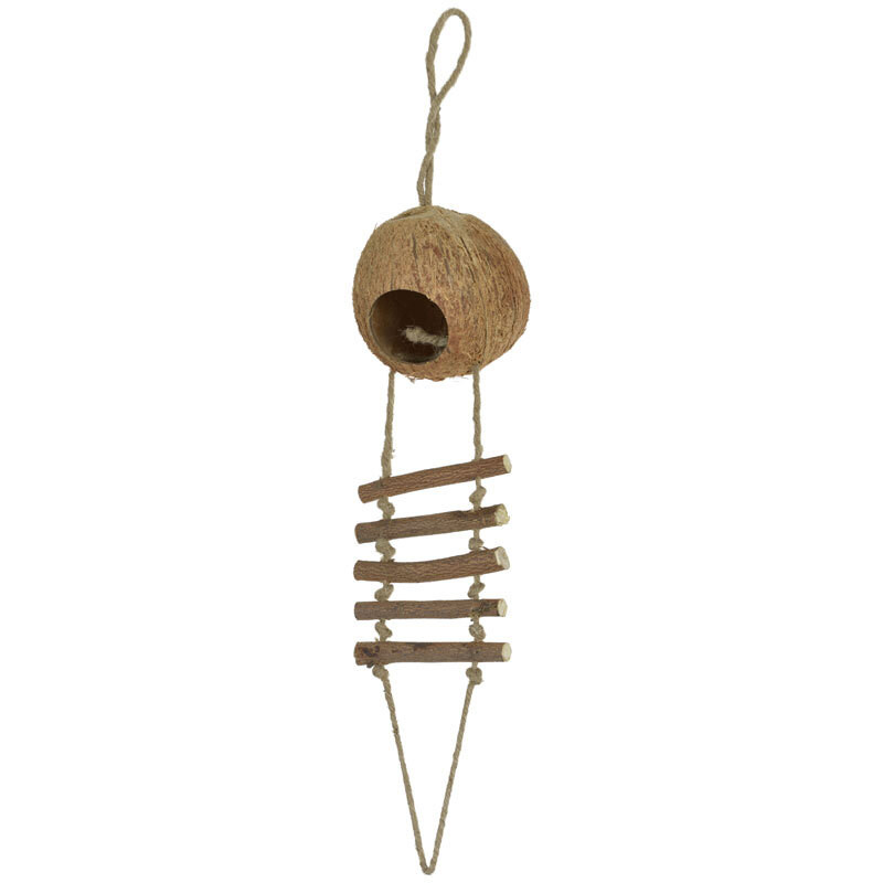 Un accesoriu ideal pentru a îmbogăți mediul de viață al animalelor mici, oferindu-le atât activitate, cât și confort. Construită exclusiv din materiale naturale, această jucărie suspendată include o scară din lemn care stimulează mișcarea și curiozitatea rozătoarelor. Forma naturală a nucii de cocos creează un adăpost perfect pentru ascuns și relaxare, în timp ce treptele scării pot fi roase în siguranță, contribuind la tocirea sănătoasă a dinților. Datorită buclei integrate, căsuța se montează rapid în orice cușcă și este disponibilă în două variante pentru a se potrivi diferitelor preferințe și spații.