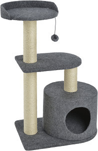 Ansamblu pentru pisici, conceput pentru a oferi un spațiu complet de relaxare, joacă și observare pentru felinele de talie mică și normală. Structura combină suprafețe de zgâriat din poliester și sisal, ideale pentru îngrijirea ghearelor și pentru a proteja mobilierul din casă. La bază se află un adăpost spațios, perfect ca refugiu intim în care pisica se poate ascunde sau odihni în liniște. Deasupra, două platforme oferă puncte de observație confortabile, unde se poate relaxa sau supraveghea împrejurimile.