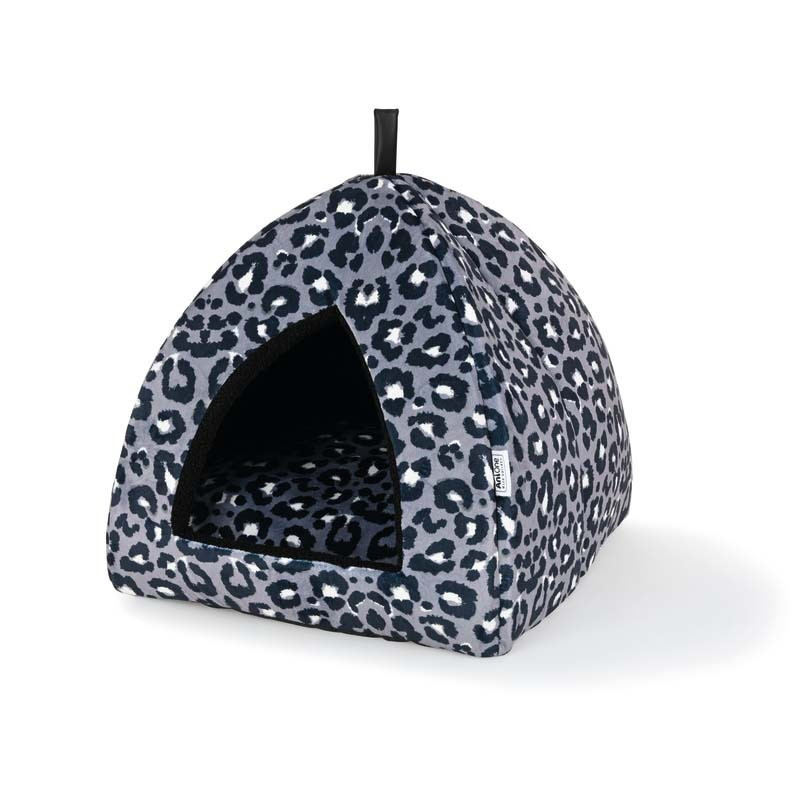 Căsuță confortabilă pentru pisici – cu design leopard și pernă reversibilă.
