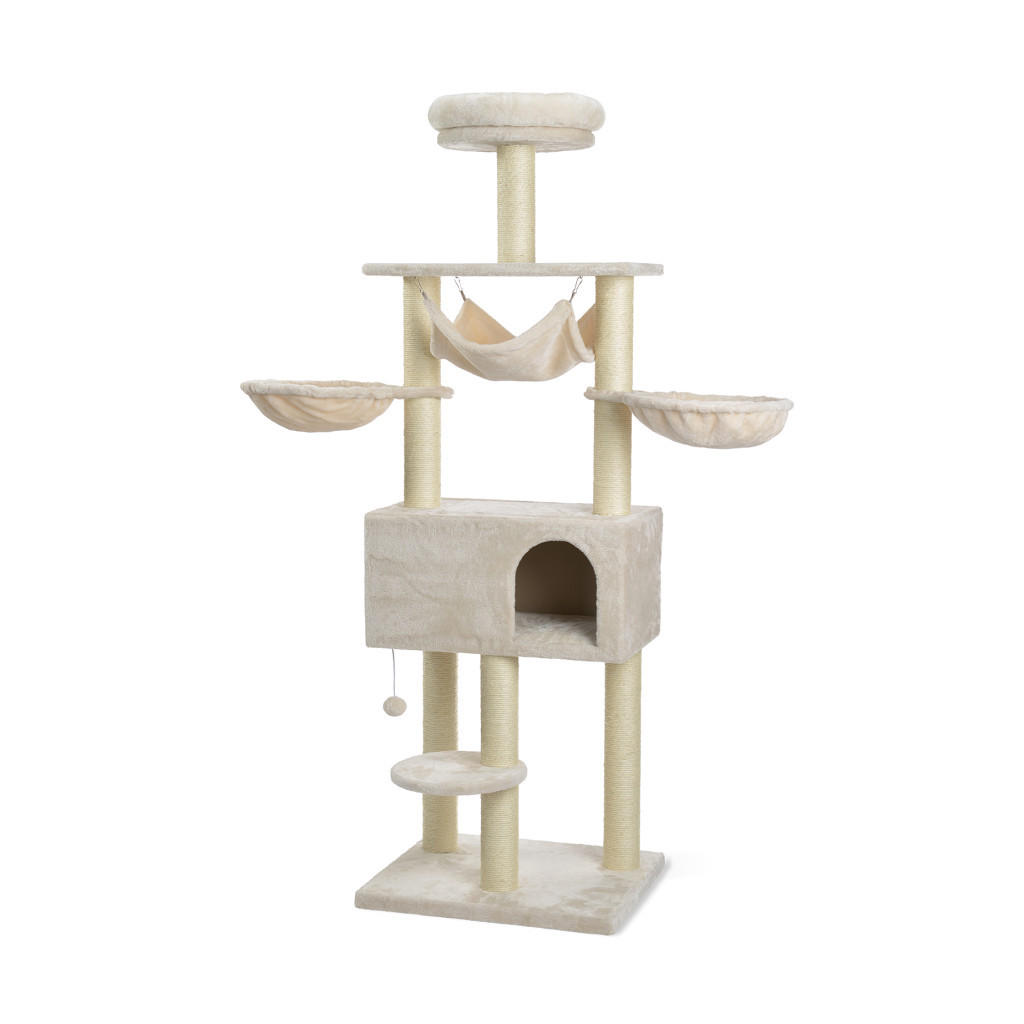 Materialul din sisal de pe stâlpi oferă suficiente zone de zgâriat pentru pisica ta, iar jucăriile incluse satisfac pofta de joacă a micuței tale feline. Arborele se remarcă prin montajul simplu, fiind livrat cu instrucțiuni și unelte incluse.