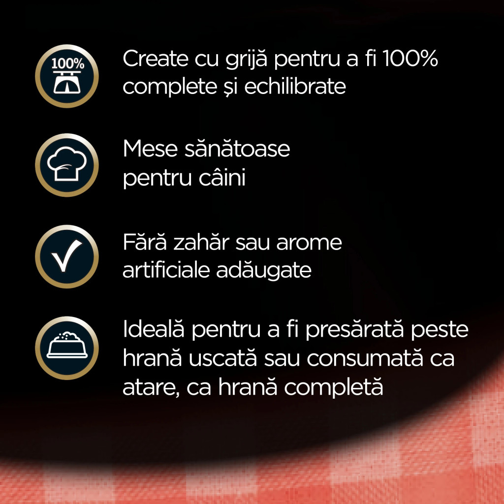 Țineți cont de caloriile care provin din recompense. Cantitățile de hrană sunt date numai ca reguli generale. Ajustați cantitatea de hrană în funcție de vârsta, talia și nivelul de activitate fizică ale câinelui dvs. Pentru alte informații detaliate, vizitați website-ul nostru. Oferiți apă proaspătă. A se servi la temperatura camerei, surplusul de hrană poate fi refrigerat până la 2 zile.