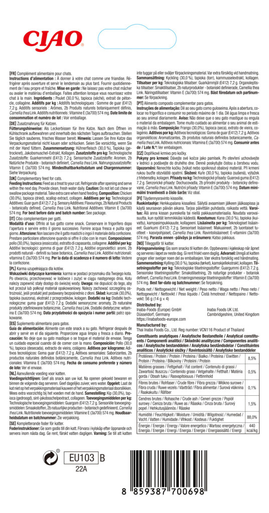 Ingrediente: apă, pui, tapioca, arome naturale, aromă naturală de pui, colagen, extract de ceai verde.