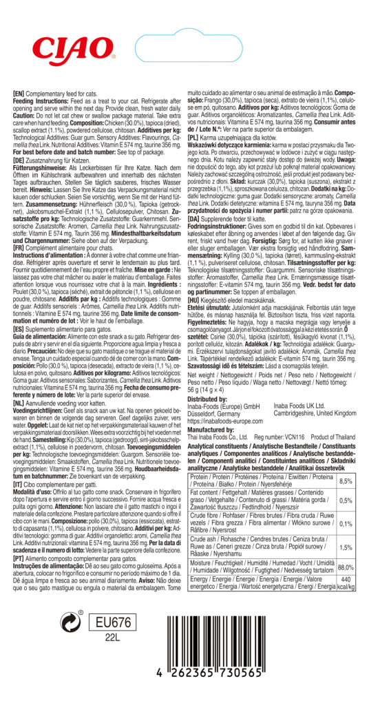 Ingrediente: pui (28,2%), tapioca (uscată), somon (1,9%), extract de scoici, chitosan.