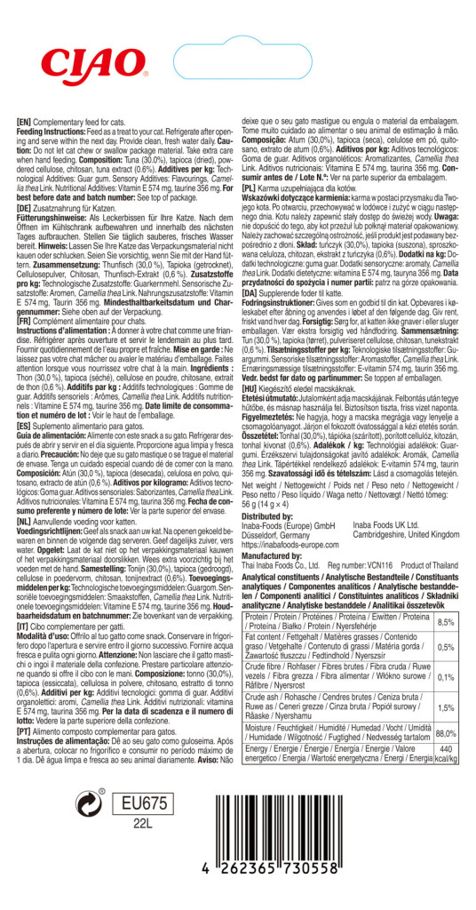 Ingrediente: ton (30%), tapioca (uscată), praf de celuloză, chitosan, extract de ton (0,6%).