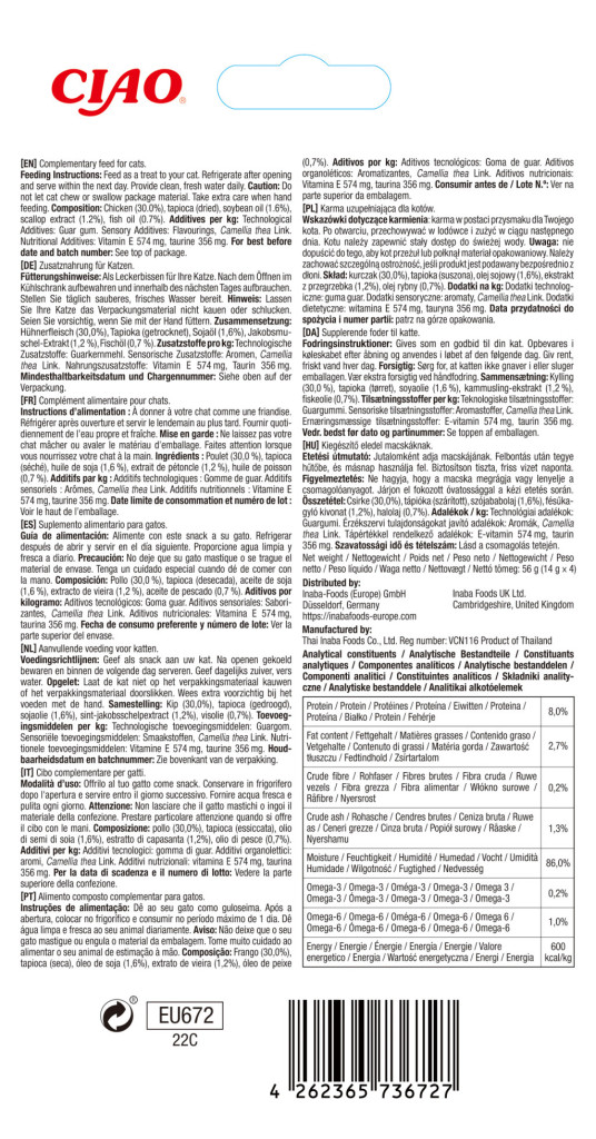 Ingrediente: pui (30,0%), tapioca (uscată), ulei de soia (1,8%), extract de ton (0,6%), ulei de pește (0,4%).
