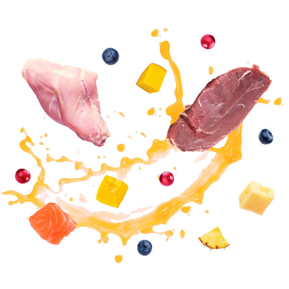 Ingrediente: 62 % carne şi derivate de origine animală în stripsuri, peşte şi derivate din peşte (4 % somon), minerale, extracte de proteină vegetală, derivate de origine vegetală, lapte şi derivate din lapte (brânzeturi praf 1,2 % (echivalent cu 2,26 % brânzeturi de umiditate naturală)), uleiuri și grăsimi (ulei de somon 0,3 %), cereale, tipuri de zahăr. 77 % carne şi derivate de origine animală în stripsuri (4 % carne de raţă), derivate de origine vegetală (praf de dovleac 0,54 % (echivalent cu 4,7 % dovleac de umiditate naturală)), extracte de proteină vegetală, minerale, uleiuri și grăsimi (ulei de somon 0,3 %), cereale, tipuri de zahăr.