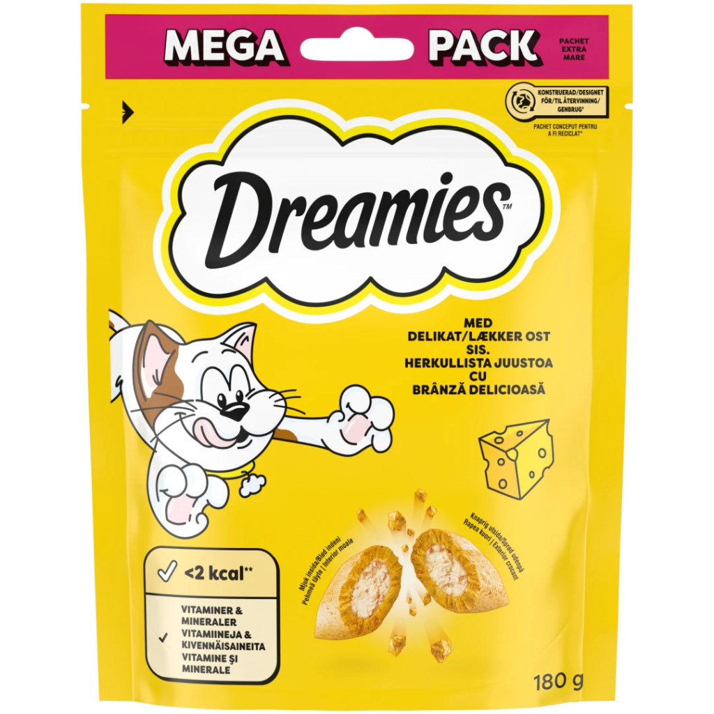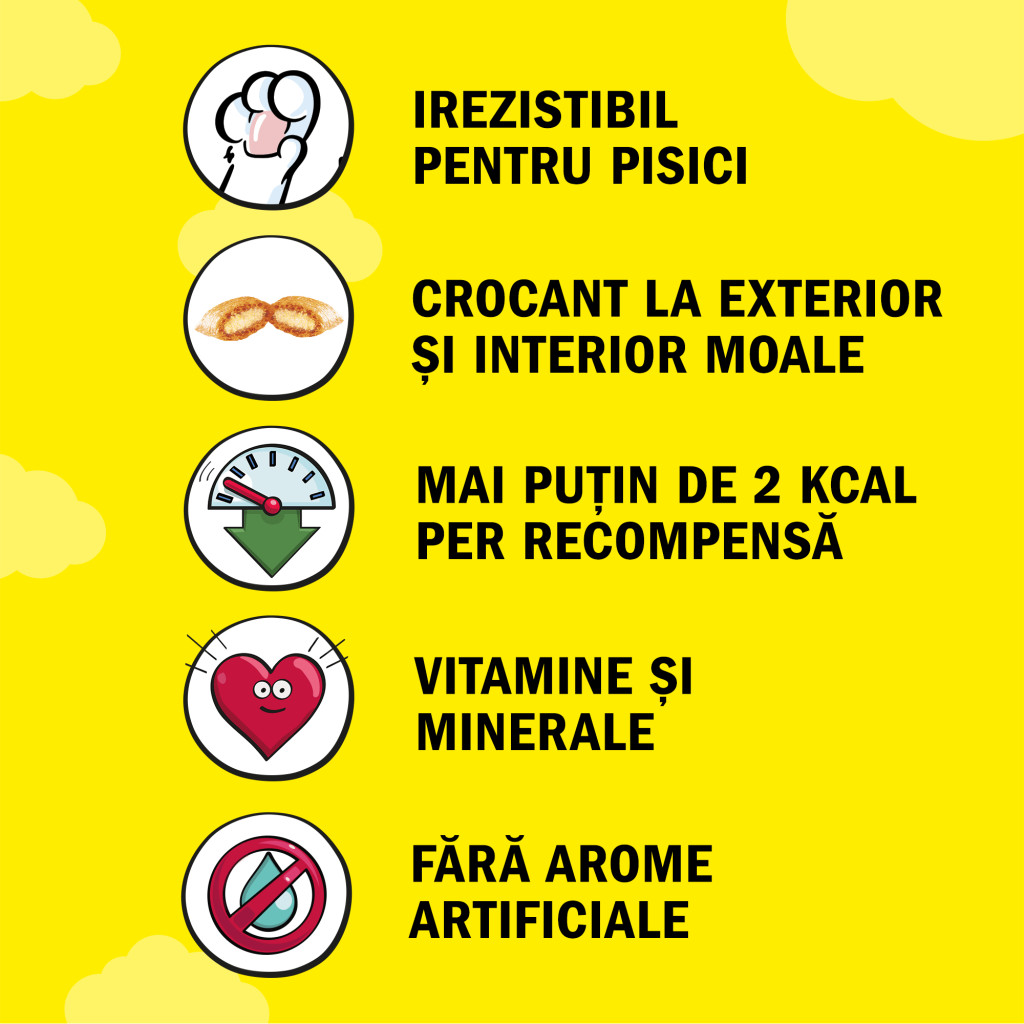 5. DREAMIES este disponibil in 7 variante delicioase: pui, vita, rata, somon, branza, curcan si ton.