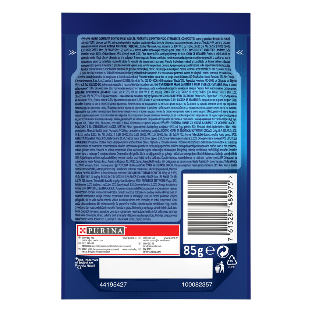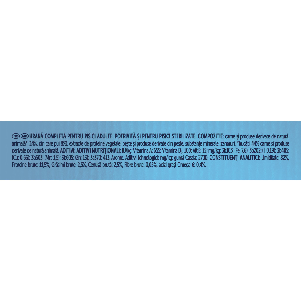 Ingrediente: carne și produse derivate de natură animală* (14%, din care pui 8%), extracte de proteine vegetale, pește și produse derivate din pește, substanțe minerale, zaharuri.
