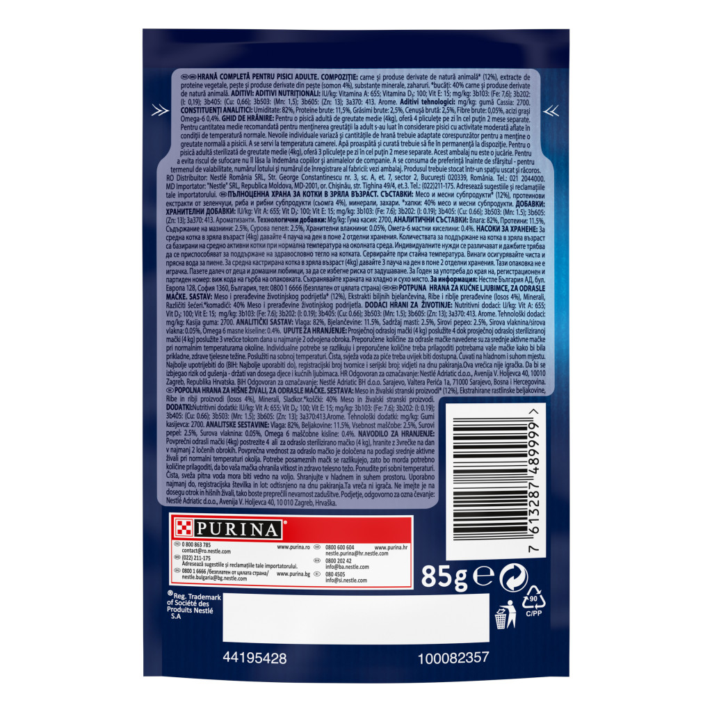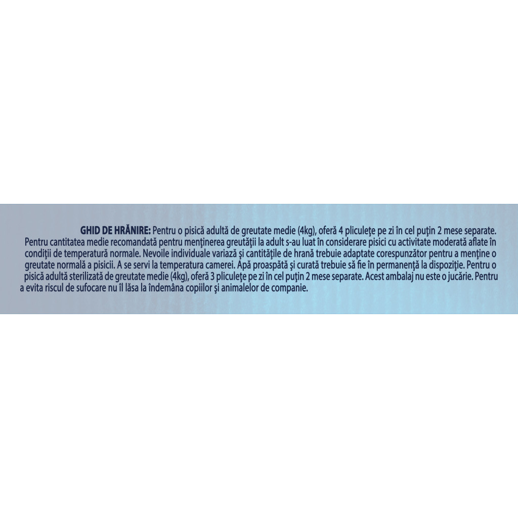 Pentru o pisica adulta de greutate medie (4 kg), ofera 4 pliculete pe zi in cel putin 2 mese separate. Pentru o pisica adulta sterilizata de greutate medie (4 kg), ofera 3 pliculete pe zi in cel putin 2 mese separate. Nevoile individuale variaza si cantitatile de hrana trebuie adaptate corespunzator pentru a mentine o greutate normala a pisicii. A se servi la temperatura camerei. Apa proaspata si curata trebuie sa fie in permanenta la dispozitie.