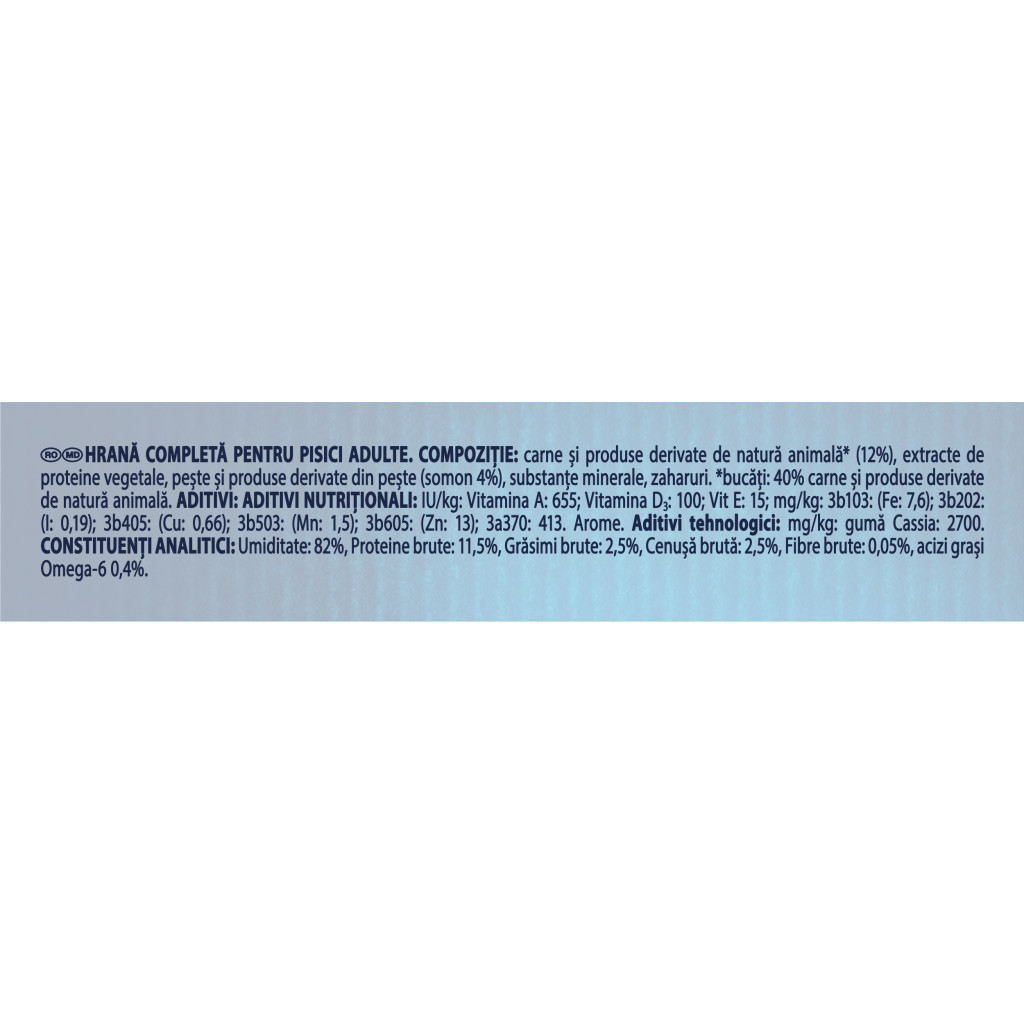 Ingrediente: carne și produse derivate de natură animală* (12%), extracte de proteine vegetale, pește și produse derivate din pește (somon 4%), substanțe minerale, zaharuri.