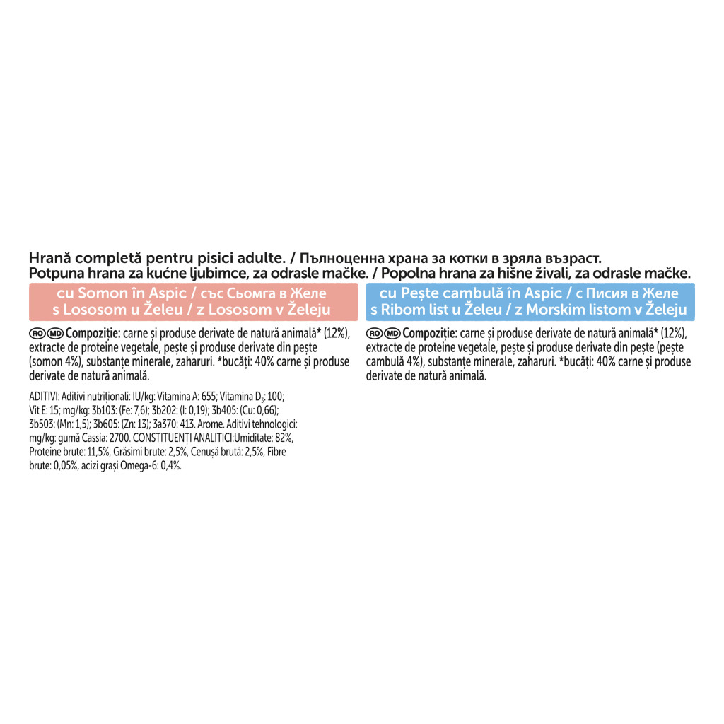 Ingrediente: carne și produse derivate de natură animală* (12%), extracte de proteine vegetale, pește și produse derivate din pește (somon 4%), substanțe minerale, zaharuri. *bucăți: 40%carne și produse derivate de natură animală.