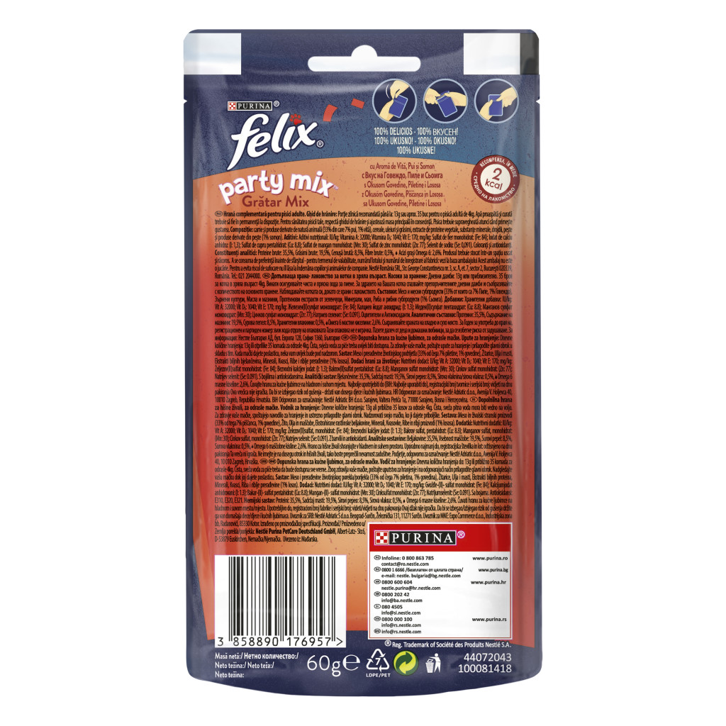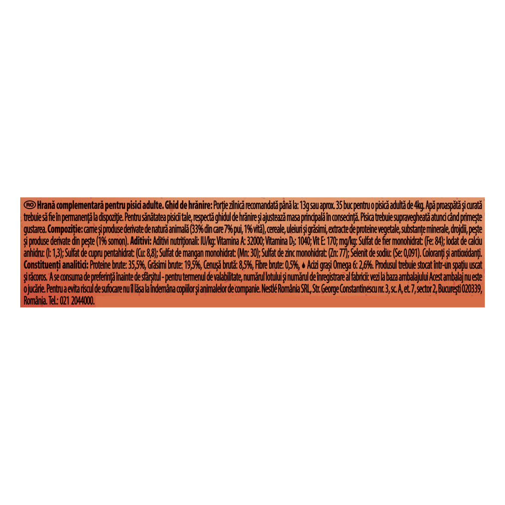 Ingrediente: Carne si produse derivate de natura animala (34%*), cereale, uleiuri si grasimi, extracte de proteine vegetale, Substante minerale, Zaharuri, drojdii, peste si produse derivate din peste (1%*).