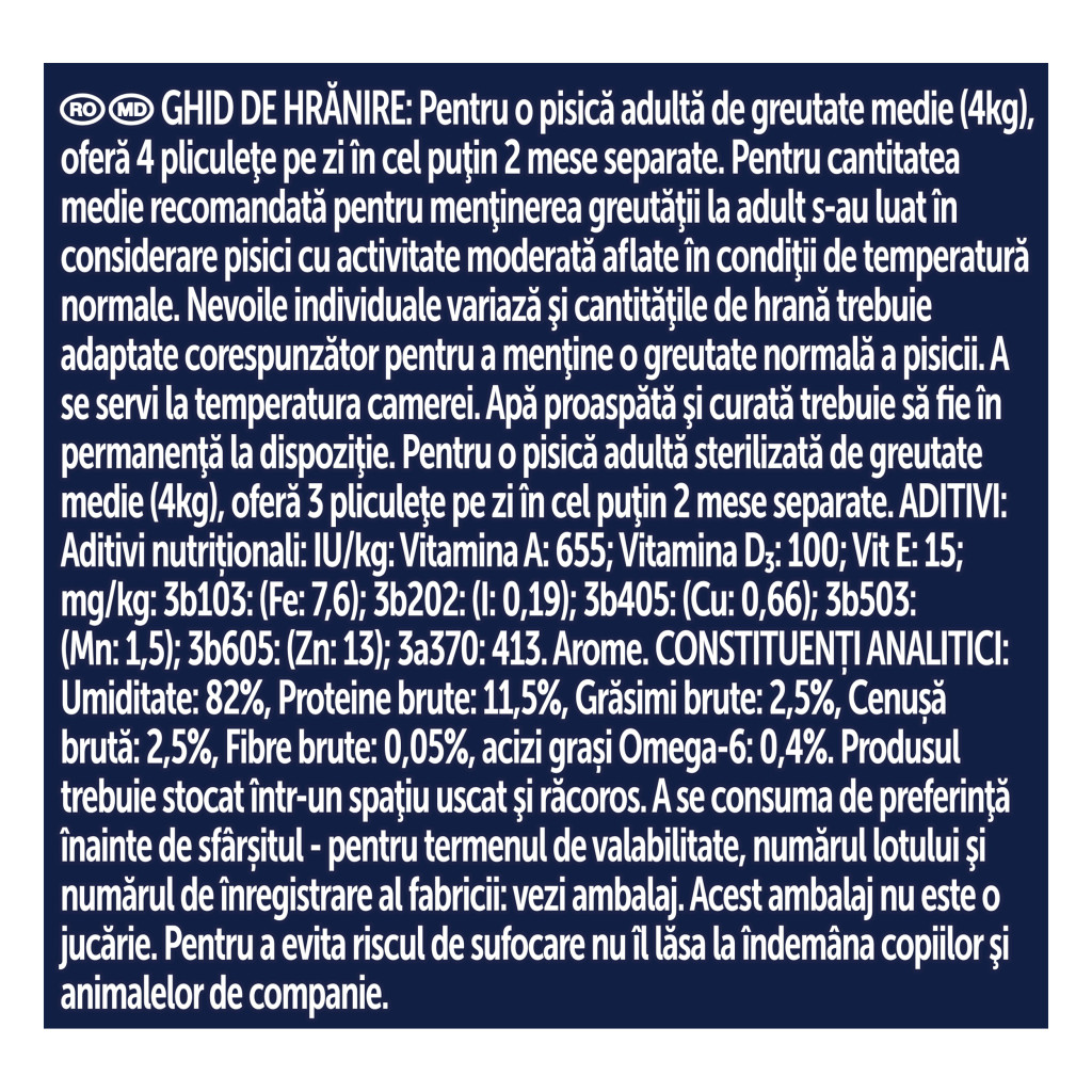 Recomandare de hranire: Pentru o pisică cu o greutate de 4 kg, serveşte între 3 şi 4 plicuri de zi în cel puţin 2 mese separate. Nevoile individuale variază şi cantităţile de hrană trebuie adaptate corespunzător pentru a menţine o greutate normală şi sănătoasă a pisicii.