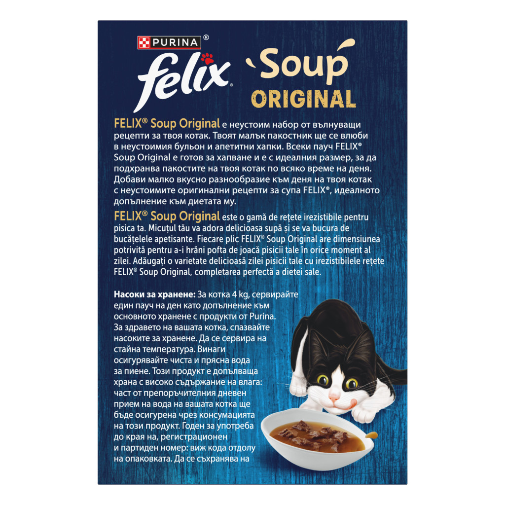 Pentru o pisică de 4 kg, toarnă conţinutul unui plic într-un castron și oferă un plic pe zi ca un supliment la alte produse complete de la Purina. Pentru sănătatea pisicii tale, te rugăm să respecți ghidul de hrănire. A se servi la temperatura camerei. Oferă întotdeauna apă curată și proaspătă pentru pisica ta. Produsul trebuie stocat într-un spaţiu uscat și răcoros.