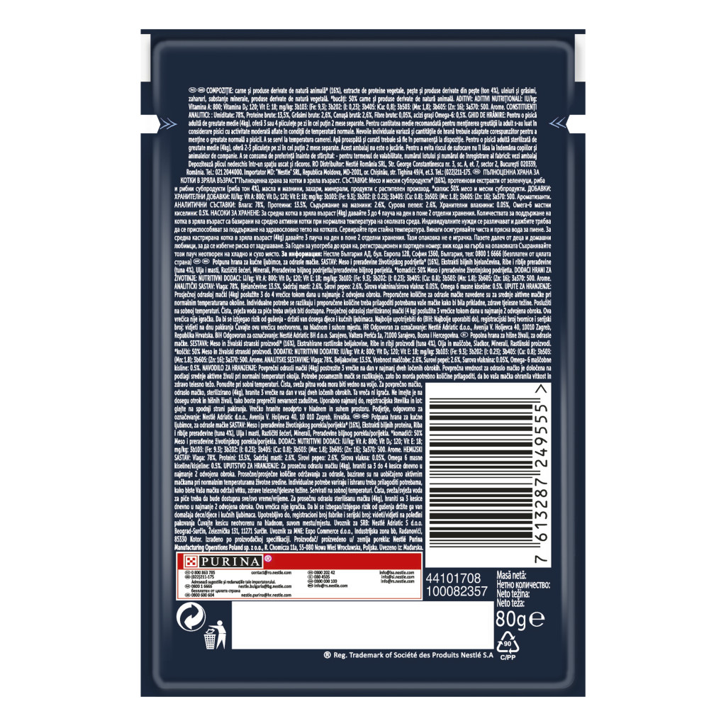 Recomandare de hrănire: Pentru o pisică adultă de greutate medie (4kg), oferă 3 sau 4 pliculețe pe zi în cel puțin 2 mese separate. Nevoile individuale variază și cantitățile de hrană trebuie adaptate corespunzător pentru a menține o greutate normală a pisicii. A se servi la temperatura camerei. Apă proaspătă și curată trebuie sa fie în permanență la dispoziție.