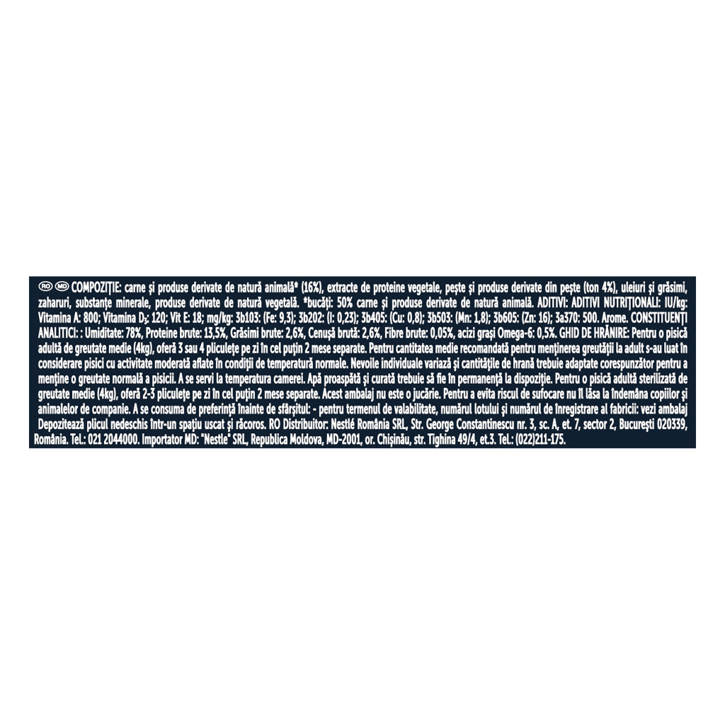 Ingrediente: carne și produse derivate de natură animală* (16%), extracte de proteine vegetale, pește și produse derivate din pește (ton 4%), uleiuri și grăsimi, zaharuri, substanțe minerale, produse derivate de natură vegetală. *bucăți: 50% carne și produse derivate de natură animală.