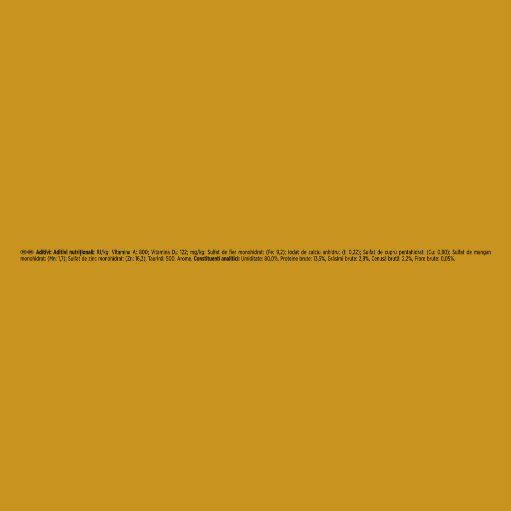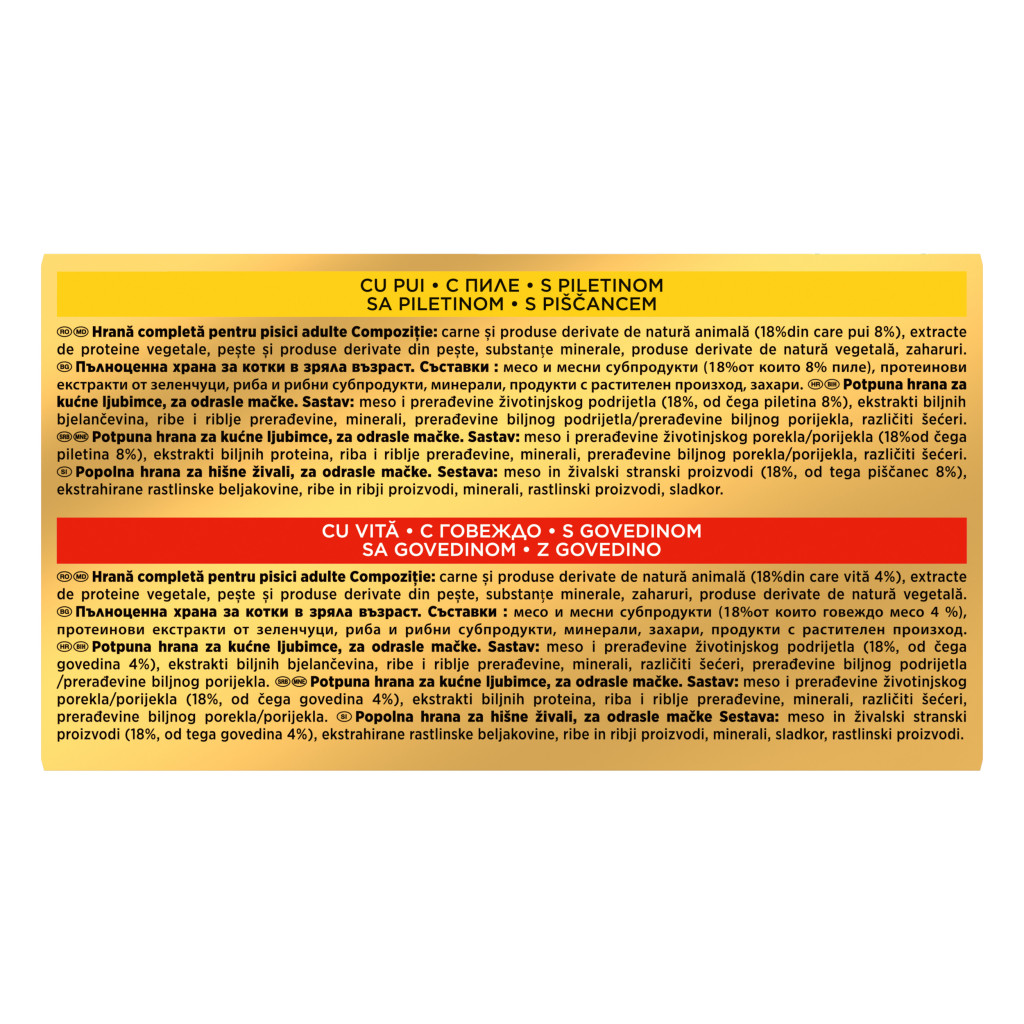 Ingrediente: Carne și produse derivate de natură animală (18%din care vită 4%), extracte de proteine vegetale, pește și produse derivate din pește, substanțe minerale, zaharuri, produse derivate de natură vegetală.