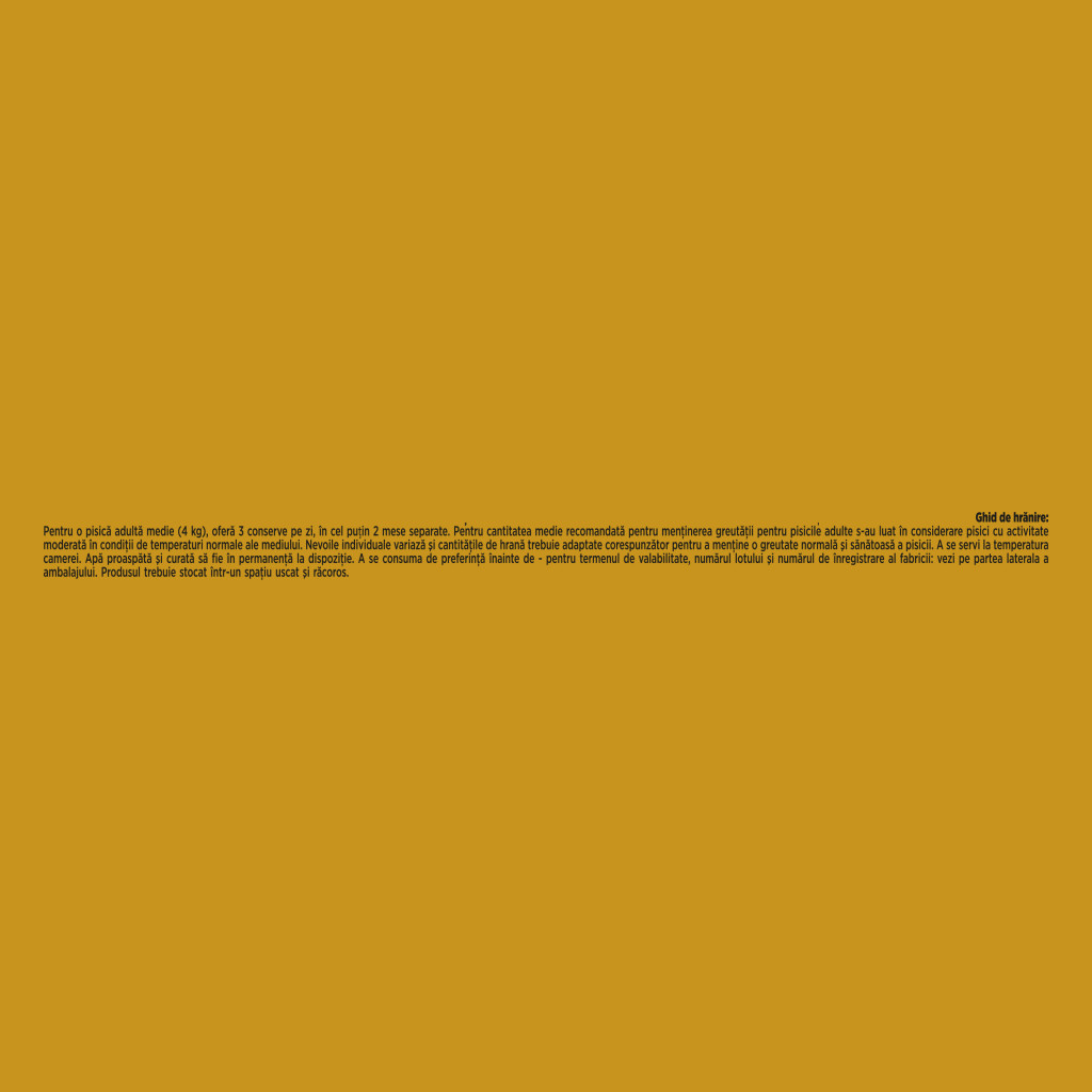 Pentru o pisica adulta de greutate medie (4 kg), oferiti 3 conserve pe parcursul zilei, în cel puțin 2 mese separate. Valorile medii de întreținere pentru adulți se bazează pe pisici moderat active la temperaturi de mediu normale. Nevoile individuale variază și hrănirea trebuie ajustată în funcție de necesități pentru a menține pisica la o greutate corporală sănătoasă și suplă. Servește hrana la temperatura camerei. Asigură-te că pisica are întotdeauna apă proaspătă și curată la dispoziție.