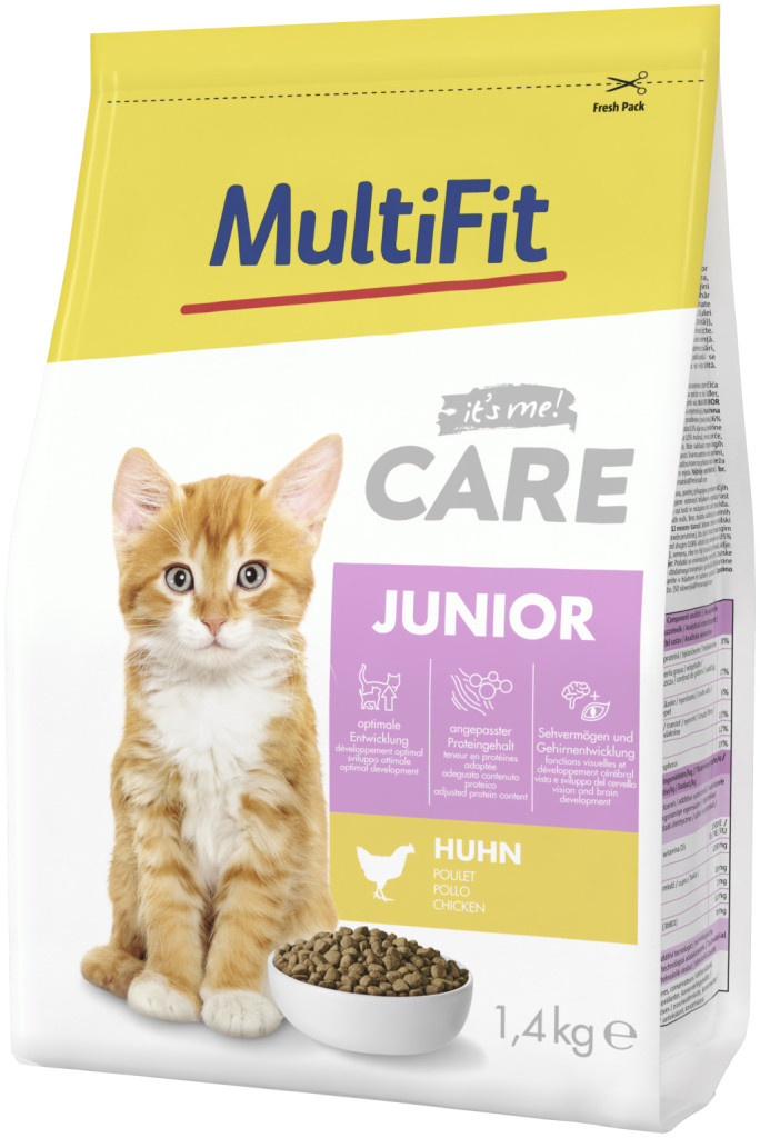 MultiFit CARE JUNIOR este potrivit pentru pisicile tinere cu digestie sensibilă. Fără zahăr adăugat sau coloranți artificiali. Hrană completă pentru pisoi cu vârsta cuprinsă între 2 și 12 luni.