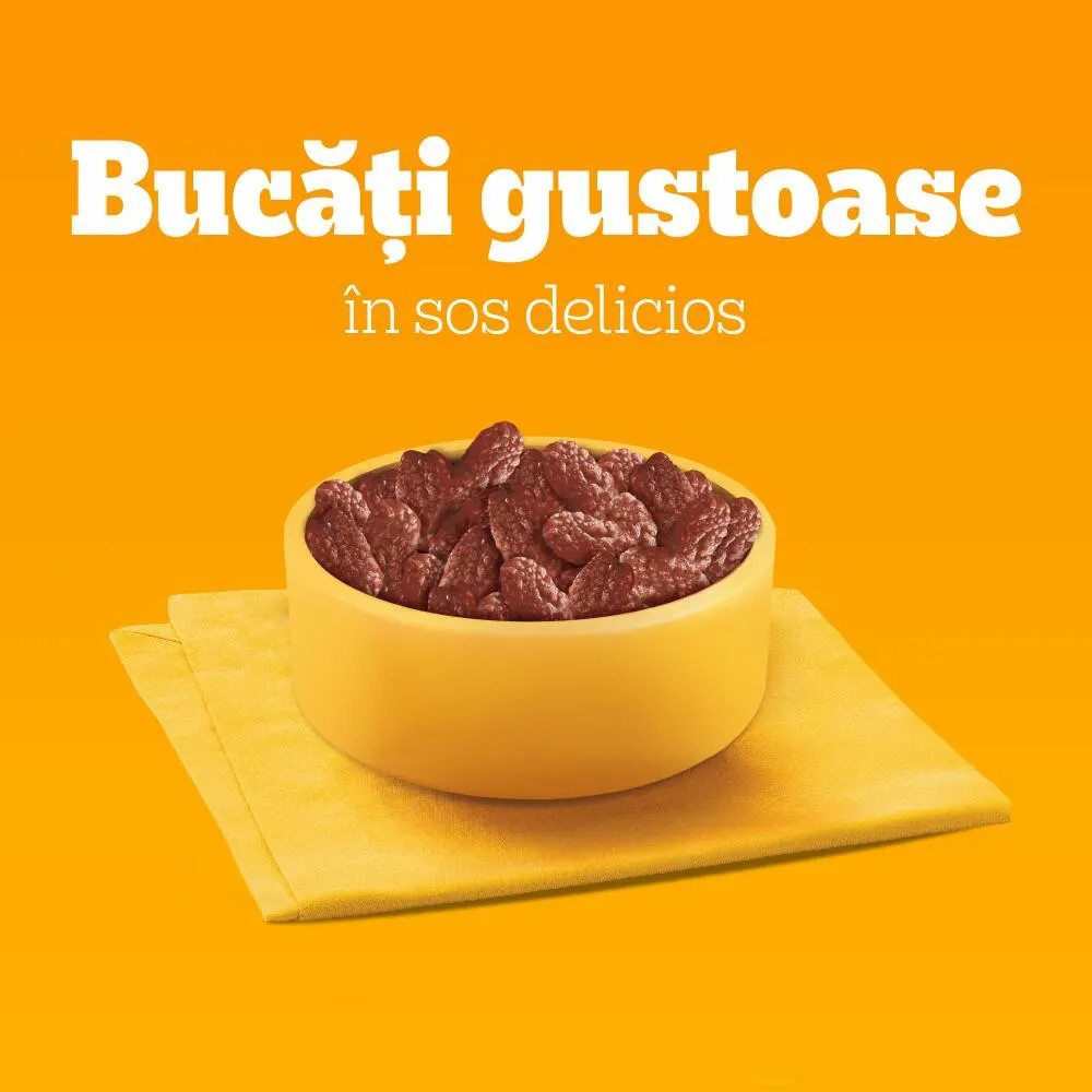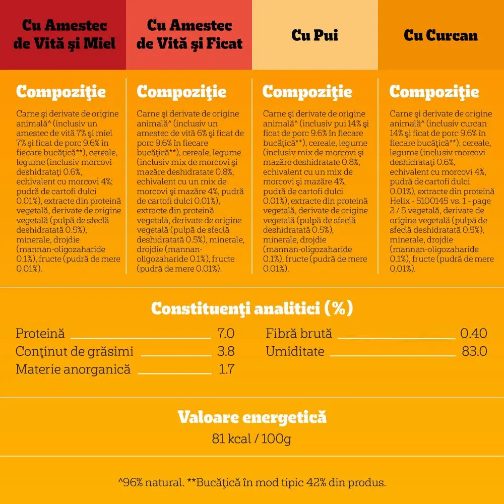 Ingrediente: Cu vită și amestec de miel și morcovi: carne și derivate de origine animală (inclusiv un amestec de vită 7%, miel 7% și ficat de porc 9.6% în fiecare bucățică**), cereale, legume (inclusiv morcovi deshidratati 0.6%, echivalent cu morcovi 4%; pudră de cartofi dulci 0.01%), extracte din proteină vegetală, derivate de origine vegetală (pulpă de sfeclă deshidratată 0.5%), minerale, drojdie (mannan-oligozaharide 0.1%), fructe (pudră de mere 0.01%). **Bucățica în mod tipic 42% din produs.