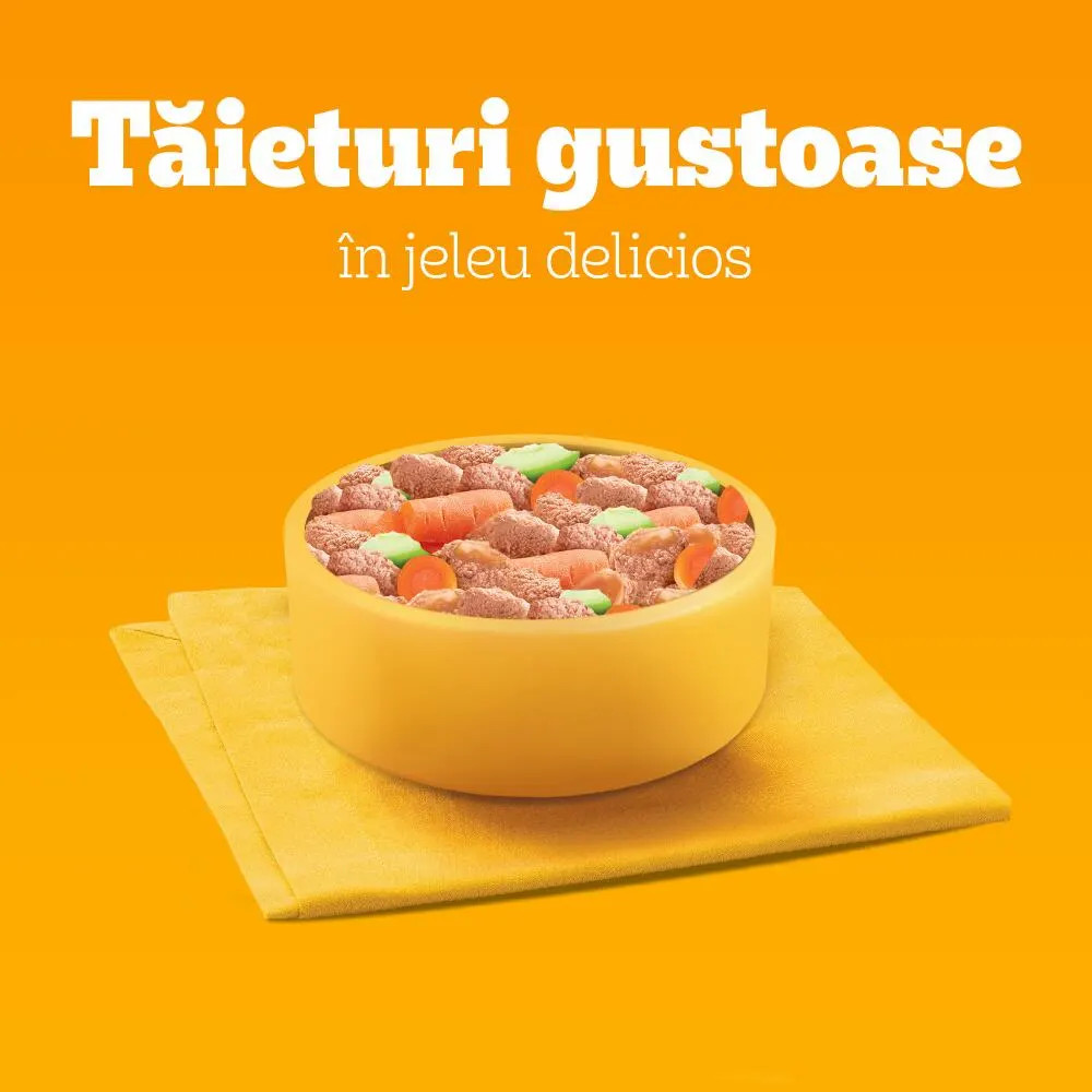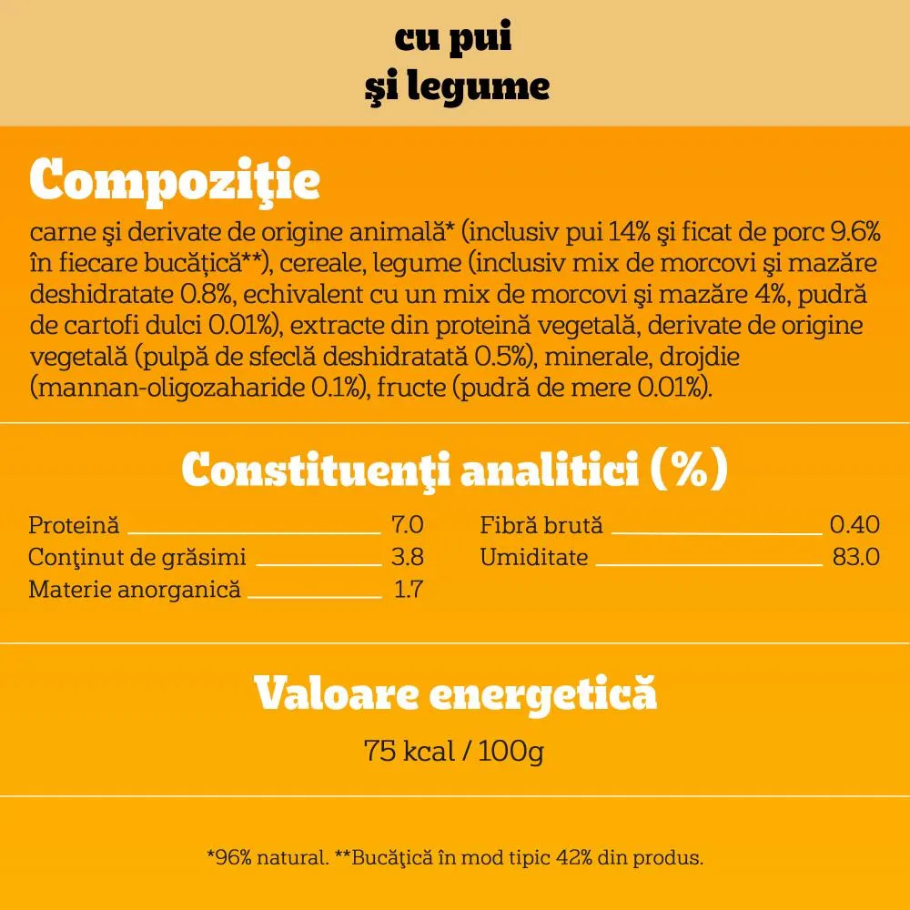 Ingrediente: carne și derivate de origine animală (inclusiv pui 14% și ficat de porc 9.6% în fiecare bucățică**), cereale, legume (inclusiv mix de morcovi și mazăre deshidratate 0.8%, echivalent cu un mix de morcovi și mazăre 4%; pudră de cartofi dulci 0.01%), extracte din proteină vegetală, derivate de origine vegetală (pulpă de sfeclă deshidratată 0.5%), minerale, drojdie (mannan-oligozaharide 0.1%), fructe (pudră de mere 0.01%). ^96% natural. **Bucățica în mod tipic 42% din produs.