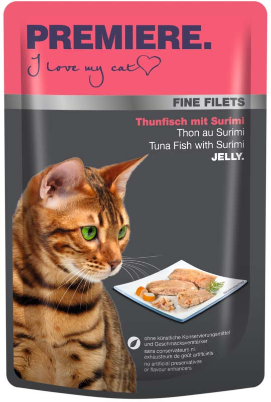 Ingrediente: ton 47%, surimi 5%, supă de pește 0,75%, clorură de potasiu 0,38%.