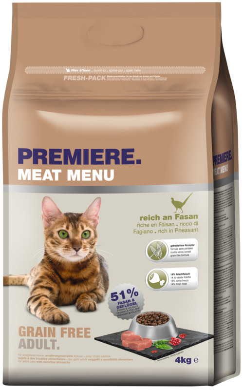 Ingrediente: proteină uscată de fazan (14%), carne proaspătă de pasăre (14%, inclusiv 4% pui), făină de cartofi (14%), pudră de cartofi (12,2%, uscată), mazăre, proteină uscată de pasăre (11,3%), jumări (măcinate), grăsime de pasăre, proteină hepatică hidrolizată (1%), semințe de in (0,9%), drojdie de bere (0,9%), pudră de celuloză (0,9%), pulpă de sfeclă (0,9%), ulei de somon (0,45%), pudră de cicoare (0,19%, inulină 0,1%), Yucca schidigera (0,1%), rodie (0,04%), oregano (0,008%), pătrunjel (0,008%), maghiran (0,008%), salvie (0,008%), cimbru (0,008%).