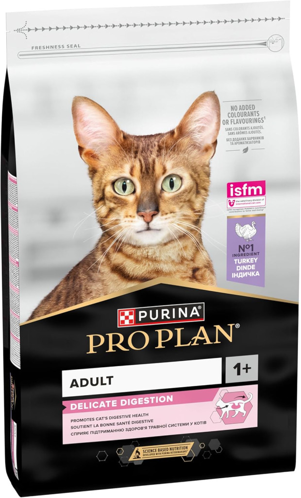 PURINA® PRO PLAN® Adult 1+ DELICATE DIGESTION, cu curcan de înaltă calitate ca ingredient principal și formulă fără grâu, este o hrană completă pentru pisici adulte cu digestie sensibilă sau apetit pretențios, concepută pentru a susține sănătatea digestivă, rinichii și imunitatea naturală, oferind totodată o rețetă gustoasă și ușor de digerat.