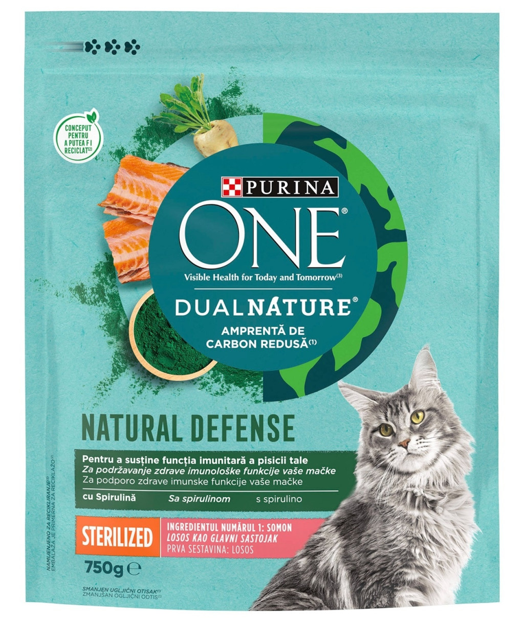 PURINA ONE® DualNature® oferă nutriție adaptată pentru pisica ta, conform expertizei noastre științifice și care este creată cu ingrediente naturale. Dezvoltată de veterinarii și nutritioniștii Purina®, este formulată cu somon fiert în aburi pentru a păstra toți nutrienții esențiali de care are nevoie pisica ta. Formulată cu spirulină pentru a ajuta la susținerea sănătății funcției imunitare a pisicii tale. Spirulina este un ingredient natural, o algă verde - albăstruie cunoscută pentru profilul unic și nutrițional robust care contribuie la multe beneficii pentru sănătate.
