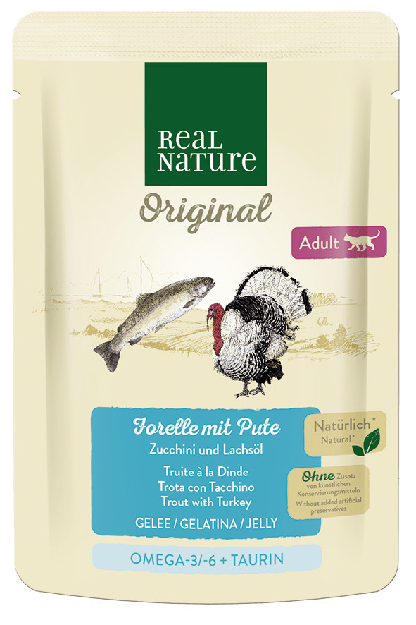 Ingrediente: 31% păstrăv, 21% curcan (inimă, carne, pipotă, ficat), 4% dovlecel, 1% minerale și 0,5% ulei de somon.