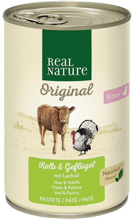 Ingrediente: 33% vițel (inimă, carne, plămâni, ficat), 30% apă potabilă, 25,5% pui (inimă, carne, ficat, pipotă, gât), 8% inimă de curcan, 2% cartofi, 1% minerale și 0,5% ulei de in.
