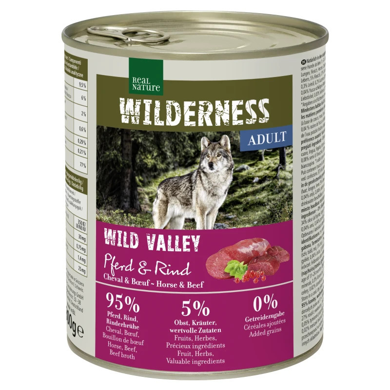 Ingrediente: 34% cal (plămâni, 8% carne, ficat, gât), 34% vită (inimă, plămâni, ficat, 5% carne), 27% bulion de vită, 3,2% coacăze roșii, 1% minerale, 0,3% ulei de in, 0,2% păpădie, 0,1% coada șoricelului, 0,1% urzică și 0,1% frunze de păducel. Poate conține urme ale altor ingrediente.