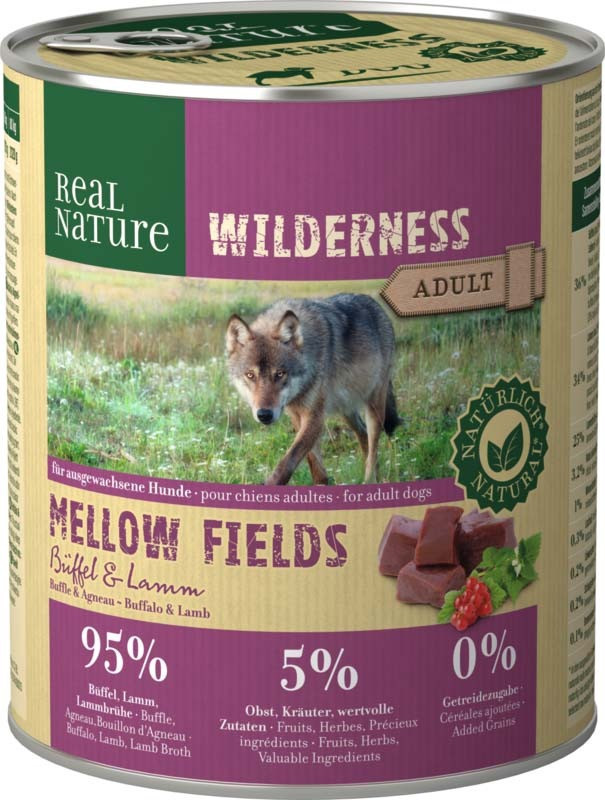 Ingrediente: 36% bivol (31% carne și produse de origine animală, 5% ficat), 34% miel (20% stomac, inimă, plămâni, ficat, carne), 25% supă de miel, 3,2% merișoare roșii, 1% minerale, 0,3% ulei de somon, 0,2% păpădie, 0,1% coada șoricelului și 0,1% urzică.