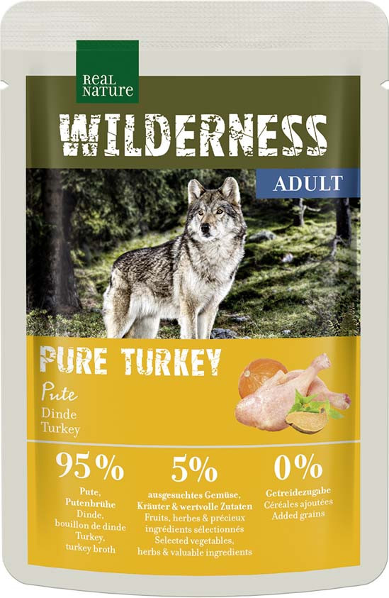 Ingrediente: curcan (inimă, ficat, pipotă, 14% carne, gât) 70%, supă de curcan 25%, cartof dulce 1,8%, dovleac 1,5%, minerale 1%, ulei de somon 0,3%, păpădie, coada șoricelului 0,1%, urzică 0,1%.