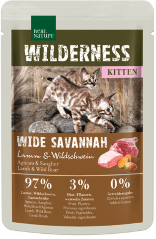 Ingrediente: 35% carne de miel (inimă, 15% carne, plămâni, ficat), 33,8% carne de mistreț (inimă, 10% carne, plămâni, ficat), 28% supă de miel, 2% coacăze negre, 1% minerale, 0,1% cactus și 0,1% ulei de in.