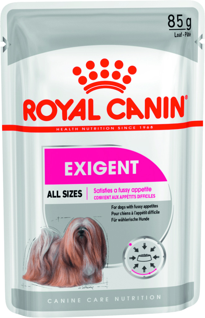 Potrivită pentru câinii de toate taliile, Exigent Loaf oferă nutrienții esențiali necesari pentru menținerea unei vieți sănătoase. În timpul mesei, câinele evaluează nu doar textura hranei, ci și aroma și mărimea bucăților.