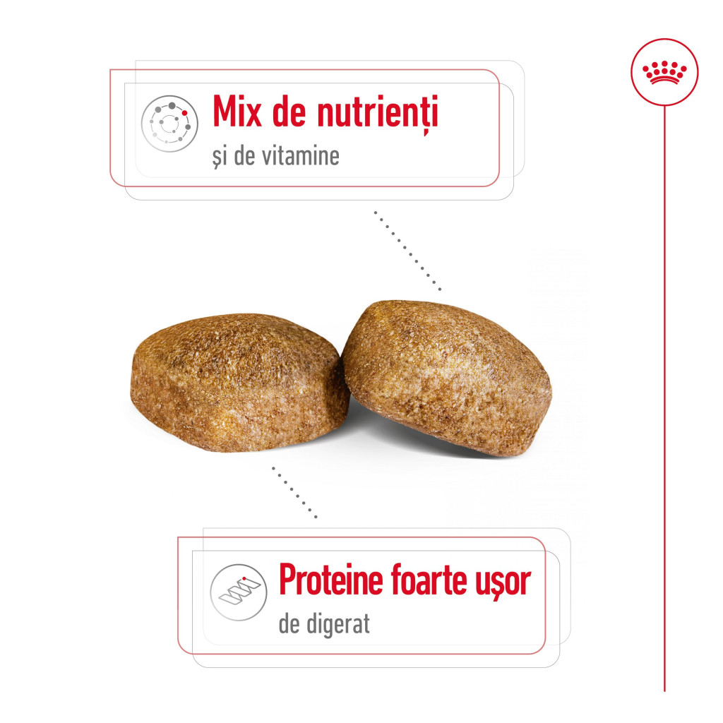 Câinii de talie foarte mare, datorită unui tranzit digestiv prelungit, sunt mai predispuşi sensibilităţilor digestive. Această formulă menţine sănătatea digestivă mulţumită proteinelor sale foarte uşor de digerat şi al aportului adaptat de fibre. Îmbogăţită cu un amestec de vitamine selecţionate cu grijă, această formulă ajută la neutralizarea radicalilor liberi şi susţine vitalitatea câinelui tău.