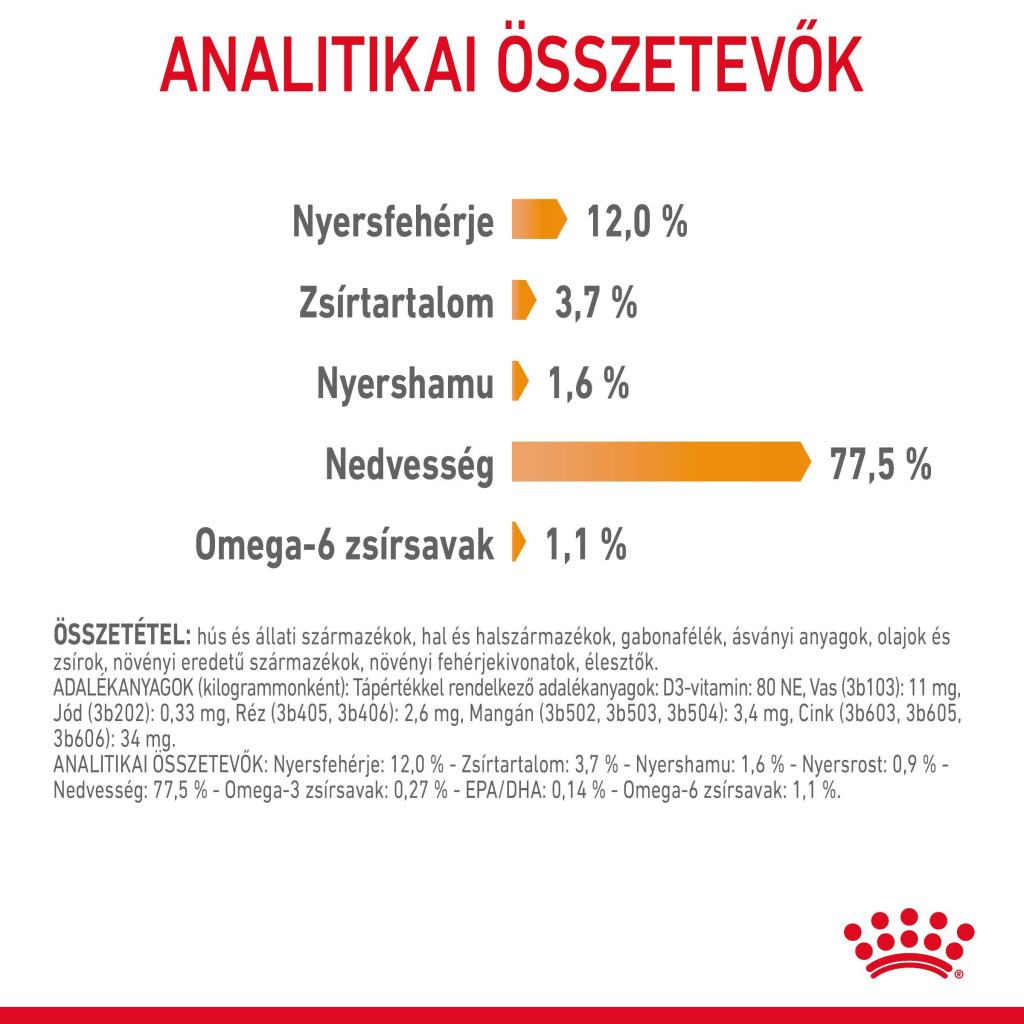 Constituenți analitici: Proteină brută: 12% - Uleiuri și grăsimi brute: 3,7% - Cenușă brută: 1,3% - Fibre brute: 1,1% - Umiditate: 78% - Acizi grași Omega-3: 0,18% - Acizi grași Omega-6: 1%.