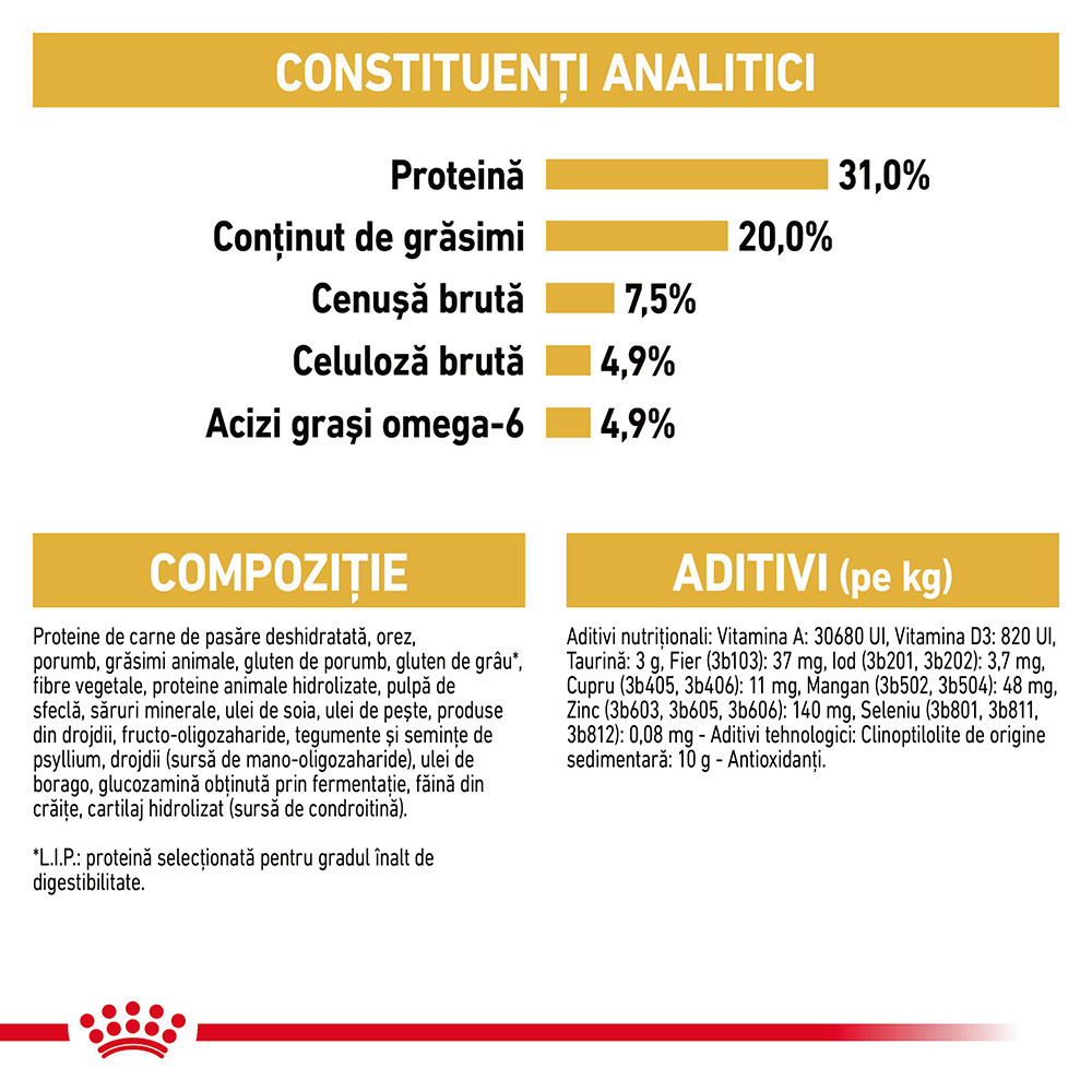 Ingrediente: proteine de carne de pasăre deshidratată, orez, porumb, grăsimi animale, gluten din porumb, gluten de grâu*, fibre vegetale, proteine animale hidrolizate, pulpă de sfeclă, săruri minerale, ulei de soia, ulei de peşte, produse din drojdii, fructo-oligozaharide, tegumente şi seminţe de psyllium, drojdii (sursă de mano-oligozaharide), ulei de borago, glucozamină obţinută prin fermentaţie, făină din crăiţe, cartilaj hidrolizat (sursă de condroitină).