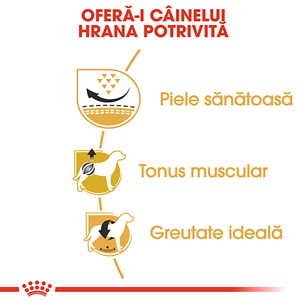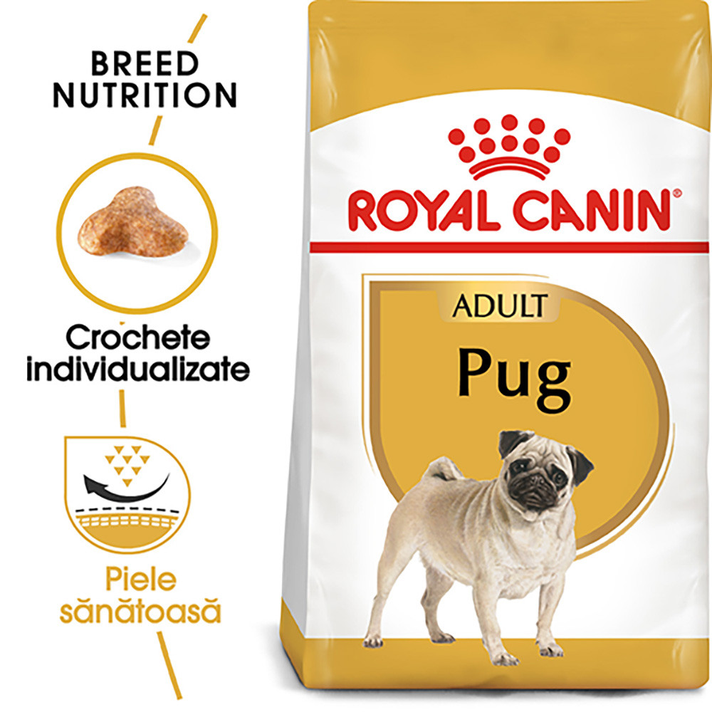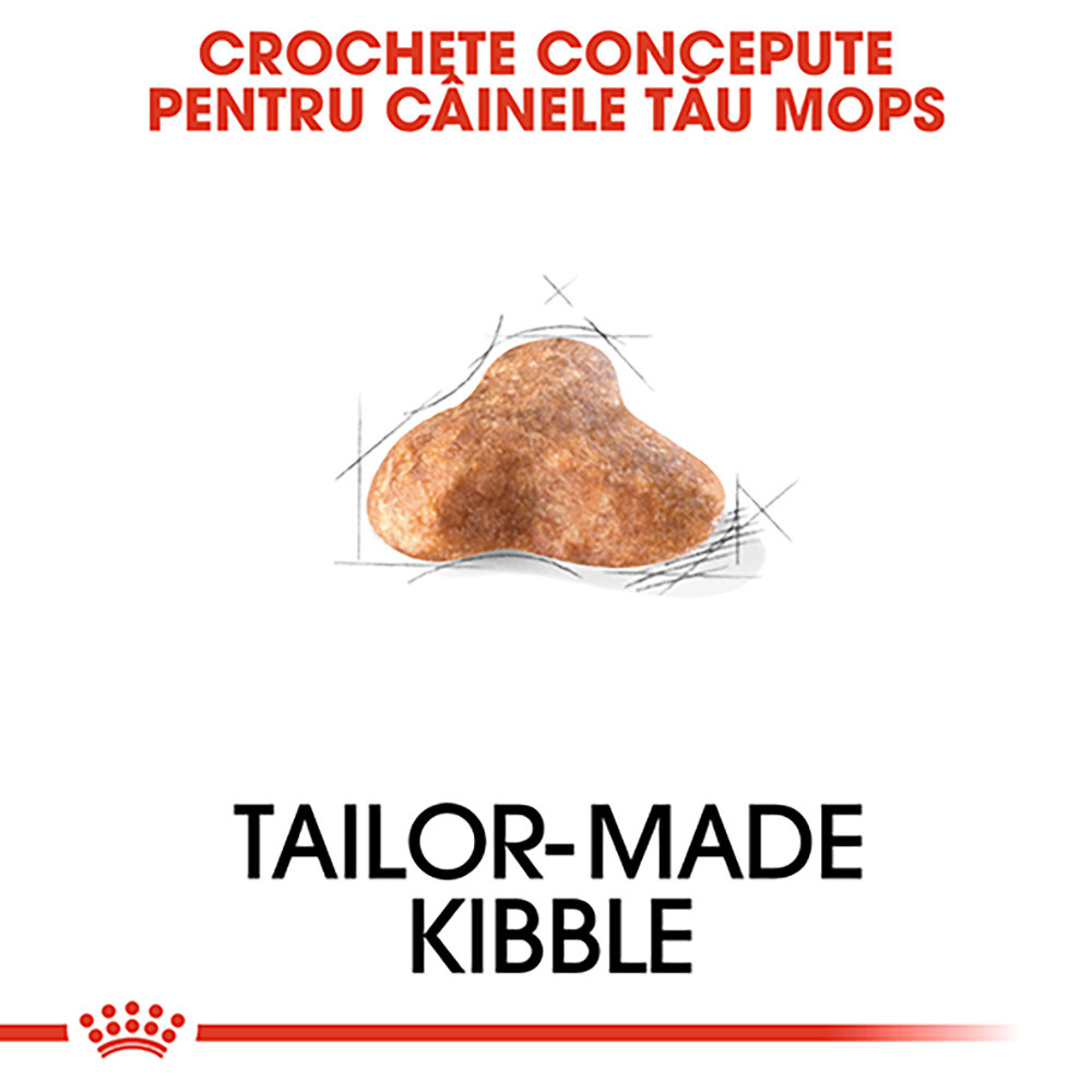 Crocheta ROYAL CANIN® Pug Adult este adaptată în mod specific pentru a corespunde caracteristicilor rasei Pug. Forma și dimensiunile crochetei sunt concepute special pentru a fi mai ușor de apucat de către câinele dumneavoastră Pug. Totodată, particularitățile acesteia stimulează câinele să mestece hrana înainte de a o înghiți.