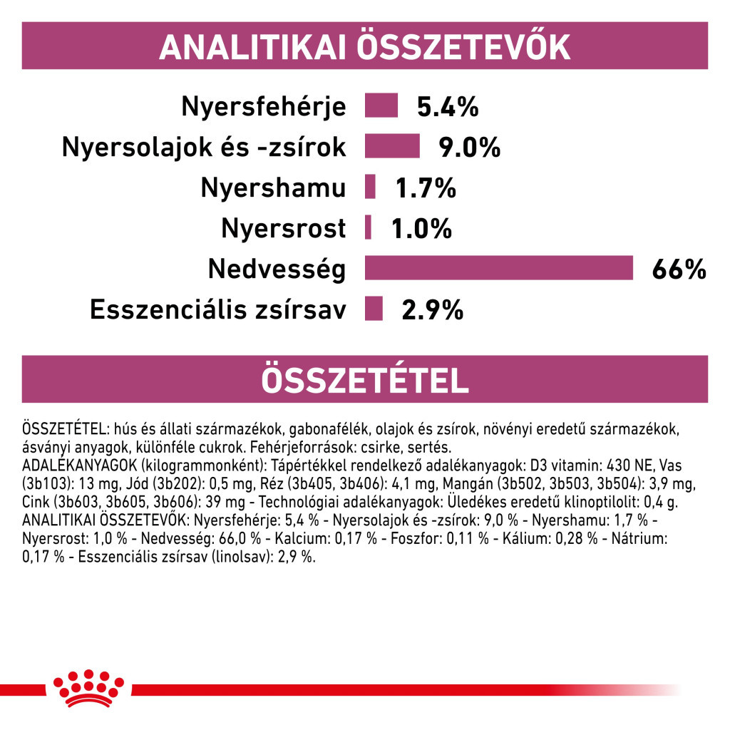 Constituenți analitici: Proteină brută: 5,4% - Conținut de grăsimi: 9,0% - Cenușă brută: 1,7% - Fibră brută: 1,0% - Umiditate: 66,0% - Calciu: 0,17% - Fosfor: 0,11% - Potasiu: 0,28% - Sodiu: 0,17% - Acid gras esențial (acid linoleic): 2,9%.