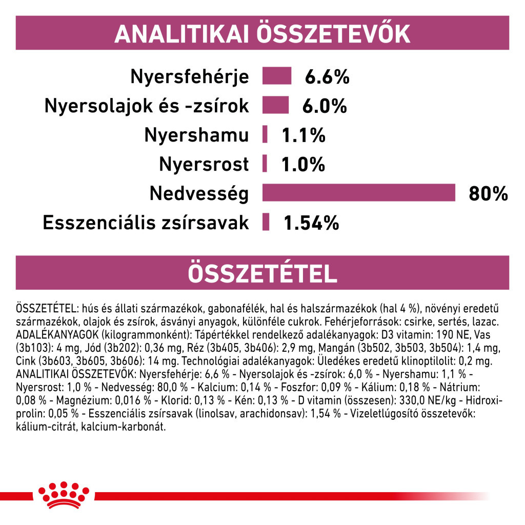 Constituenți analitici: Proteină brută: 6,6% - Conținut de grăsimi: 6,0% - Cenușă brută: 1,1% - Fibră brută: 1,0% - Umiditate: 80% - Calciu: 0,14% - Fosfor: 0,09% - Potasiu: 0,18% - Sodiu: 0,08% - Magneziu: 0,016% - Clorură: 0,13% - Sulf: 0,13% - Vitamina D (total): 330,0 UI/kg - Hidroxiprolină: 0,05% - Acizi grași esențiali (acid linoleic, acid arahidonic): 1,54% - Ingrediente alcalinizante ale urinei: citrat de potasiu, carbonat de calciu.