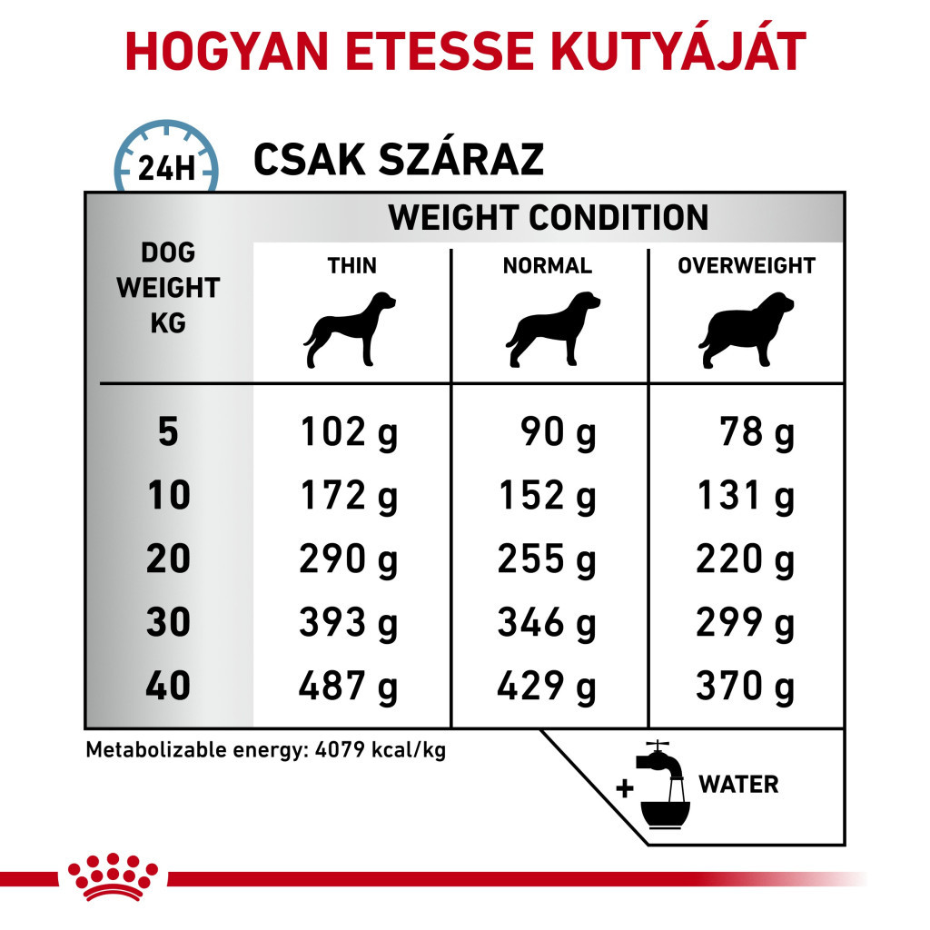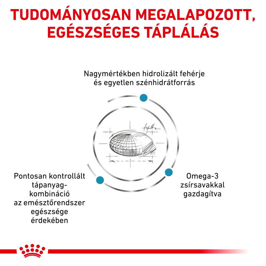 Ingrediente: făină de orez, extract proteic de soia hidrolizat, grăsimi animale, orez, ficat de pasăre hidrolizat, pulpă de sfeclă, minerale, ulei de soia, fructo-oligozaharide, ulei de pește, ulei de borago, pudră de gălbenele. Surse de proteine: extract proteic de soia hidrolizat (17,6%), ficat de pasăre hidrolizat (5,0%). Sursă de carbohidrați: orez (48,1%).