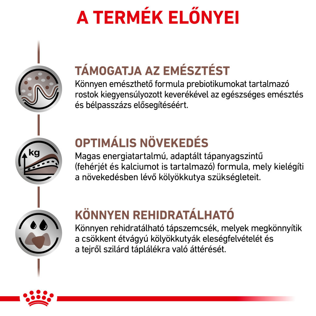 Creștere optimă: formulă cu nivel ridicat de energie și un aport adaptat de nutrienți (inclusiv proteine și calciu) pentru a satisface nevoile unui cățel în creștere.