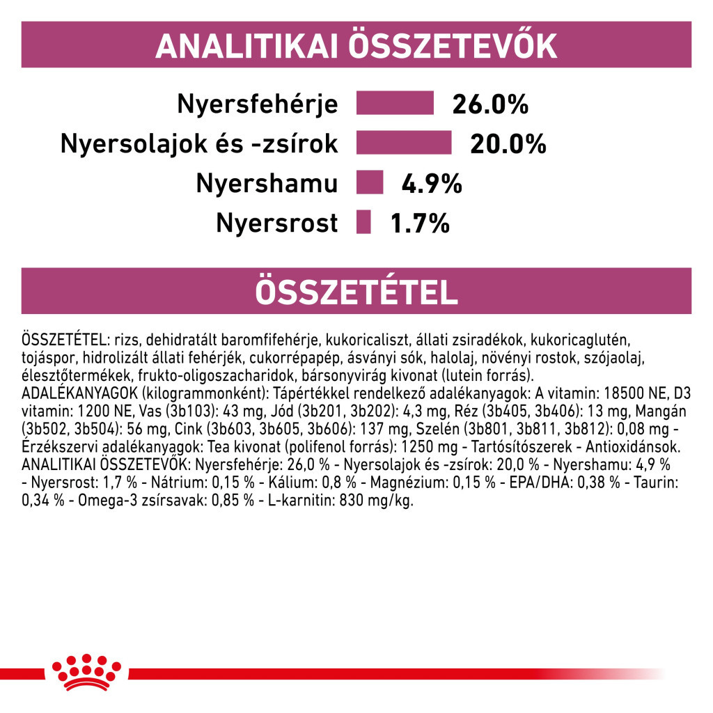Constituenți analitici: 26,0% proteine, 20,0% grăsimi, 4,9% cenușă brută, 1,7% fibră brută, 0,15% sodiu, 0,8% potasiu, 0,15% magneziu, 0,38% EPA/DHA, 0,34% taurină, 0,85% acizi grași Omega 3 și 830 mg/kg L carnitină.