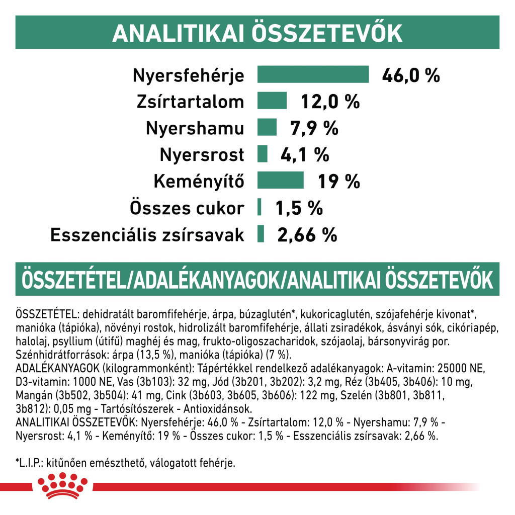 Ingrediente: proteină deshidratată de pasăre, orz, gluten de grâu*, gluten de porumb, extract proteic de soia*, manioc (tapioca), fibre vegetale, proteină hidrolizată de pasăre, grăsimi animale, minerale, pulpă de cicoare, ulei de pește, coji și semințe de psyllium, fructo-oligozaharide, ulei de soia, pudră de gălbenele. Surse de carbohidrați: orz (13,5%), manioc (tapioca) (7%).