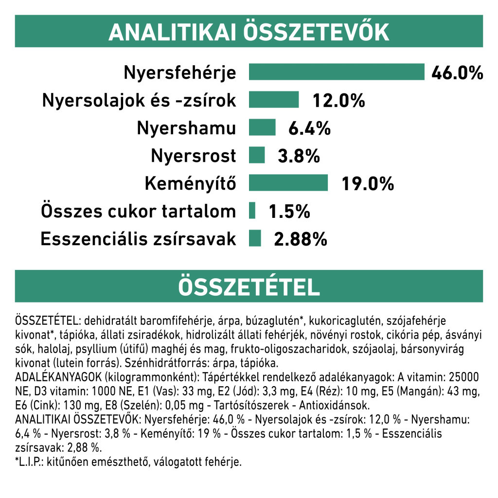 Ingrediente: proteină uscată de pasăre, orz, furaje din gluten de grâu*, gluten de porumb, izolat proteic din soia*, manioc (tapioca), lignoceluloză, proteină hidrolizată de pasăre, grăsime animală, minerale, fibre de cicoare, ulei de pește, psyllium (coji și semințe), fructo-oligozaharide, ulei de soia, făină de gălbenele.