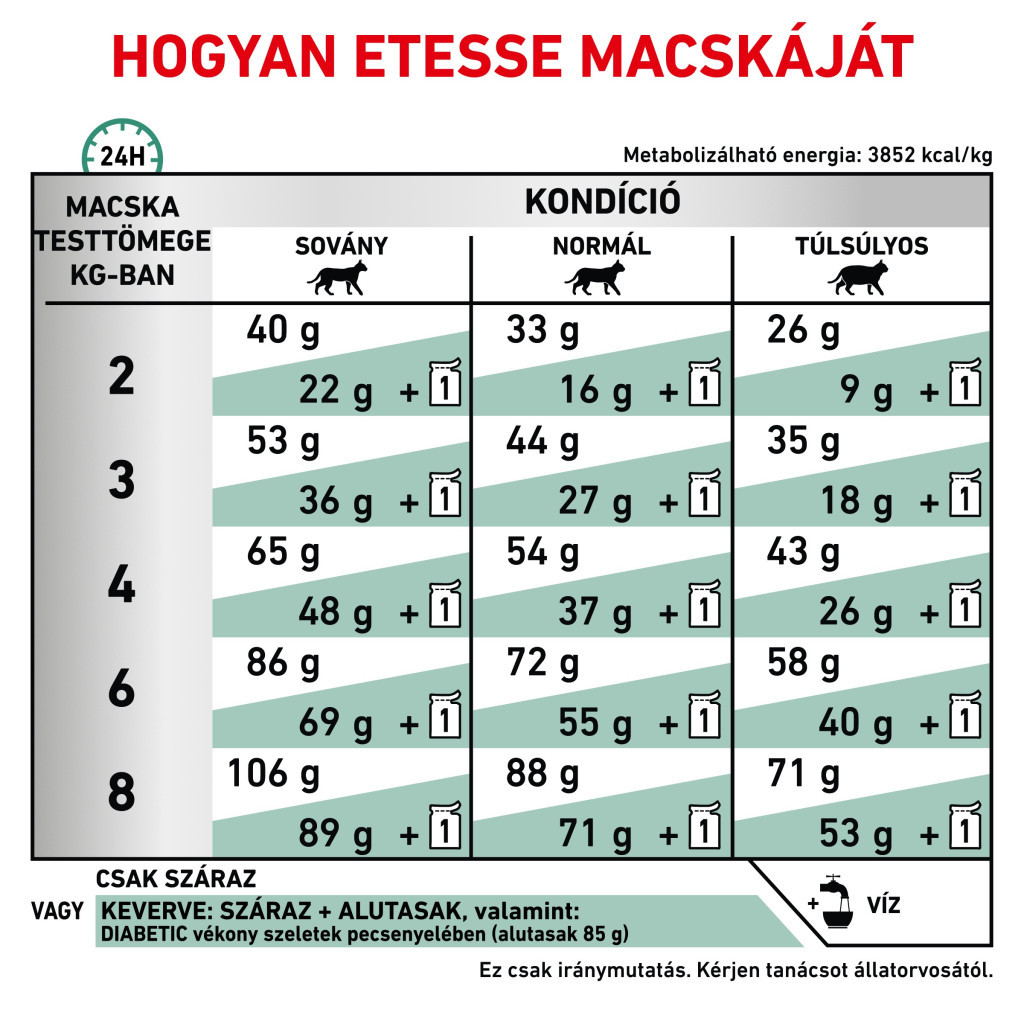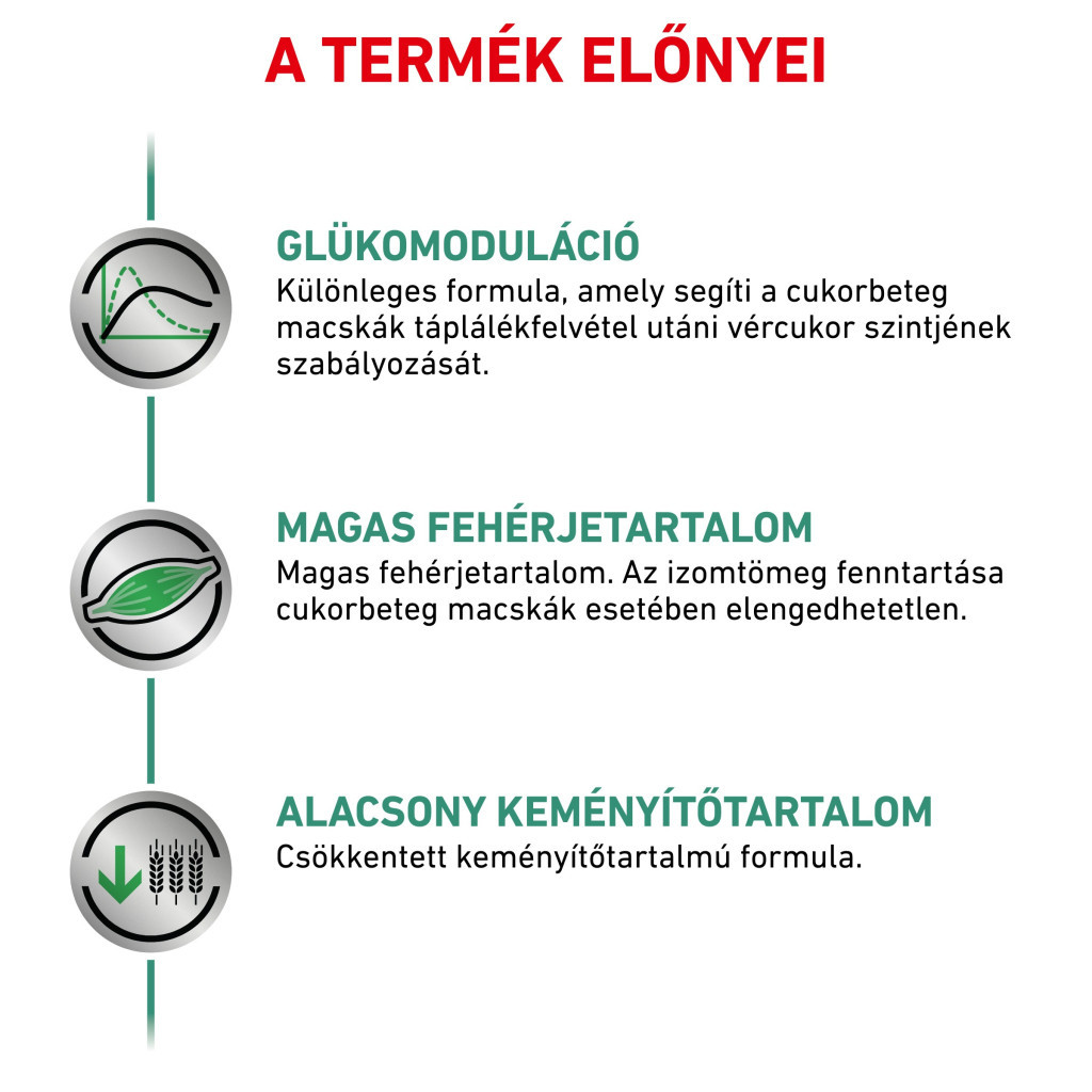 Royal Canin Diabetic ajută la controlul nivelului de glucoză datorită unui conținut ridicat de proteine și unui nivel redus de amidon, contribuind la menținerea masei musculare și la limitarea creșterilor glicemice după masă. Formula are și Index S/O, susținând un mediu urinar care reduce riscul formării calculilor de struvit și oxalat de calciu.